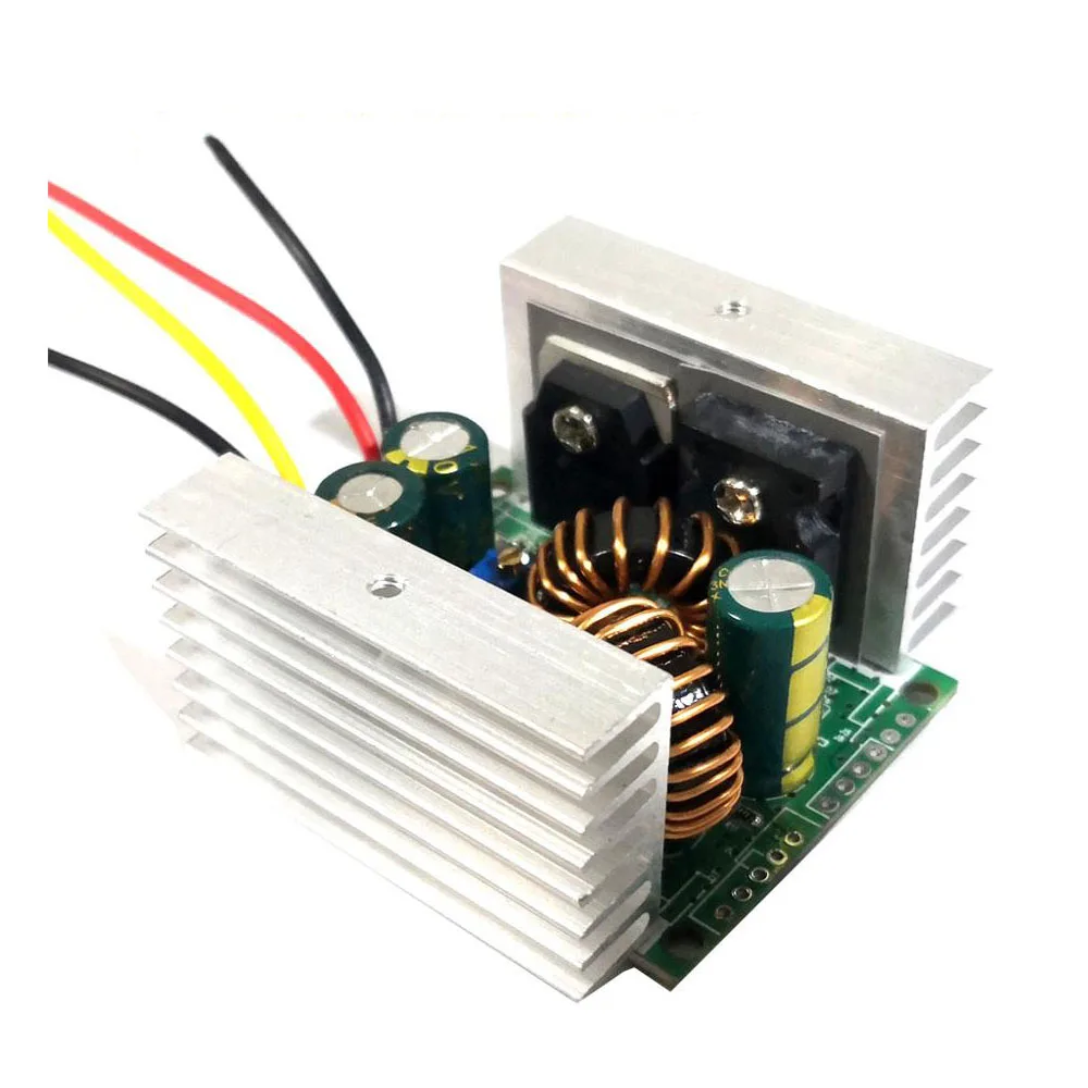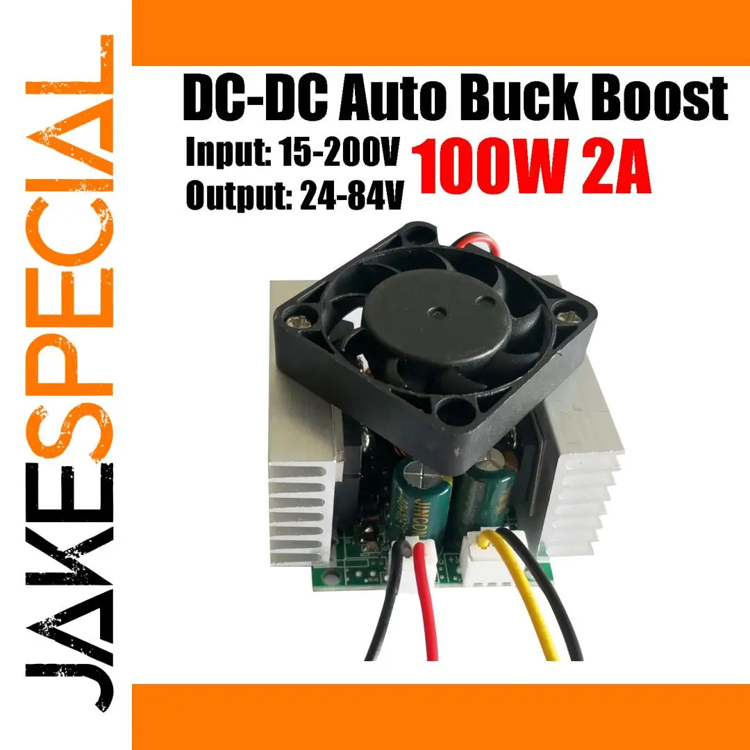 Transform your power management setup with this high-performance 100W auto buck-boost converter. Designed for versatility, it accepts input voltages from 15V to 200V and offers adjustable output voltages from 24V to 84V, including specific models at 36V, 48V, 60V, 72V, and 96V. Its compact dimensions—58mm by 58mm with a height of 30mm—make it easy to integrate into various projects. The device features a black, square-shaped cooling fan mounted on a durable heat sink with multiple fins, emphasizing its robust and industrial aesthetic. The contrasting red, black, and yellow wires add a vivid, technical look while ensuring reliable power connections. This converter provides high efficiency of over 85%, making it ideal for energy-conscious applications while maintaining a clean, modern design.