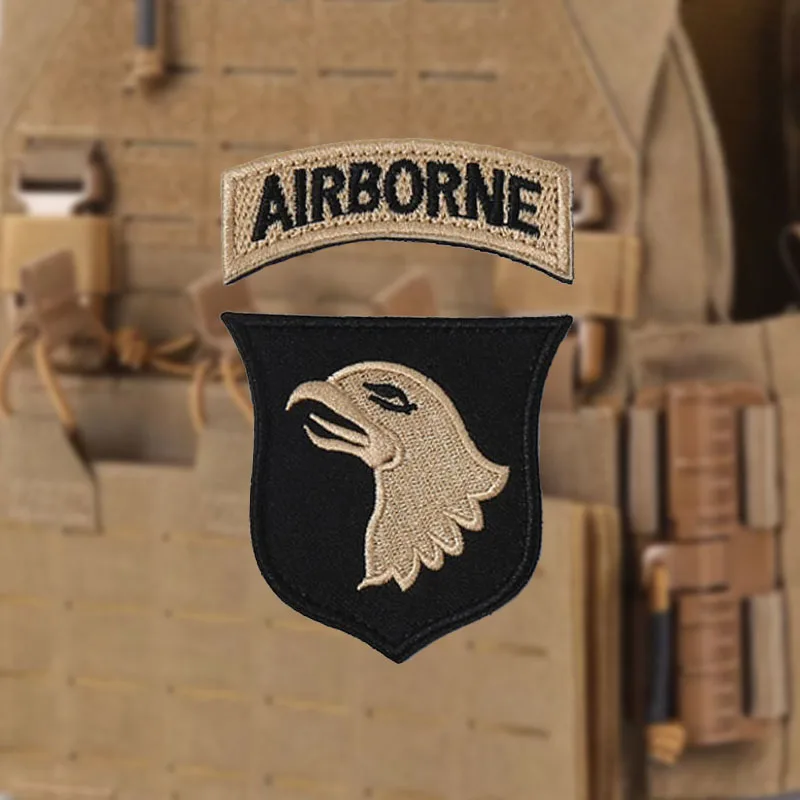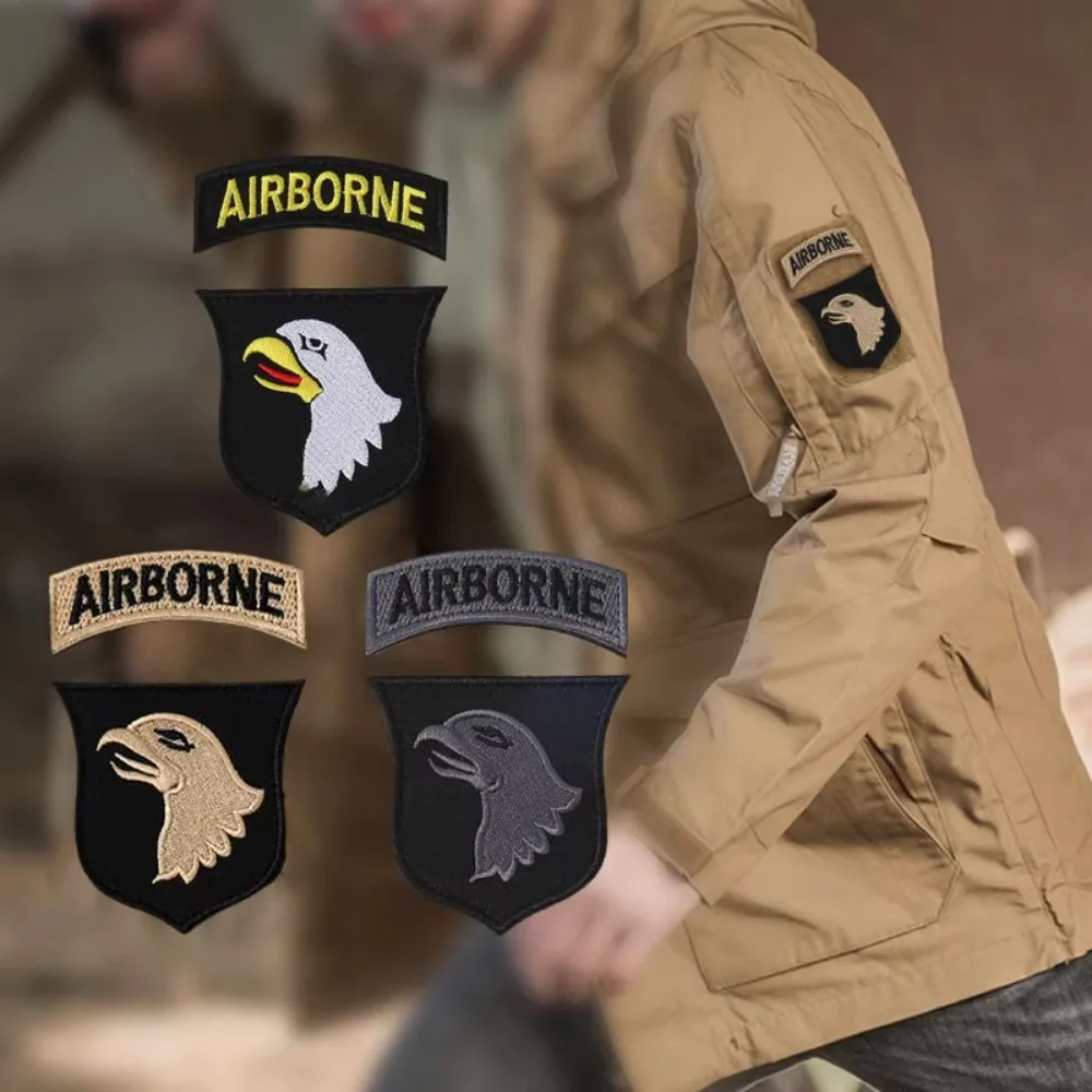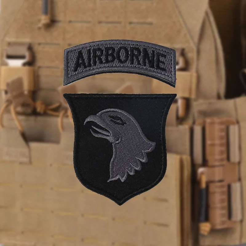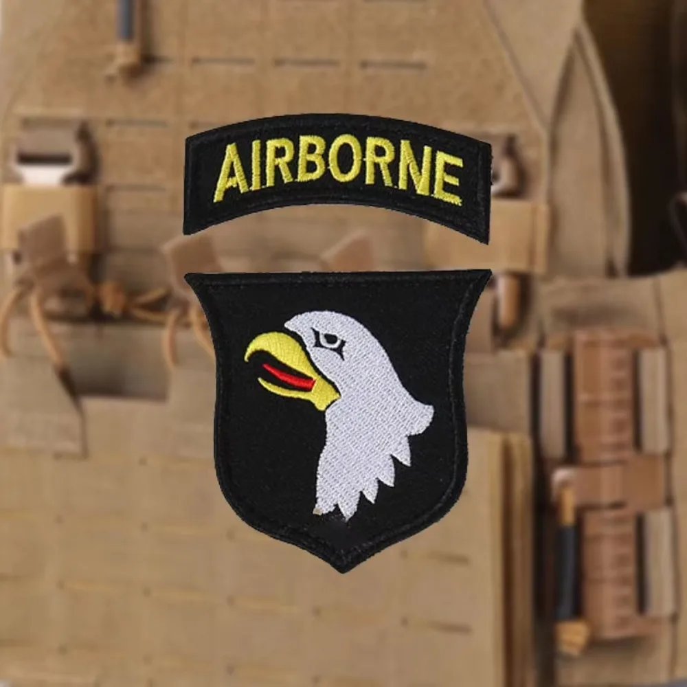 Designed for the true military enthusiast, this set of two embroidered tactical patches embodies the heritage of the 101st Airborne Division. The patches feature elegant yet practical color contrasts, with one adorned in bold black with striking yellow lettering “AIRBORNE,” while the second displays a sophisticated grey with sleek black text. Below, the shield-shaped patches flaunt intricate eagle designs, one with a vivid white and red profile against a black background, and the other showcasing a tan eagle on a dark grey backdrop. Made from durable nylon and polyester, these patches come with a hook and loop backing, making them ideal for jackets, bags, and more.