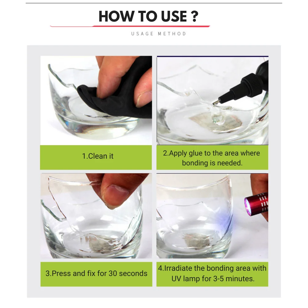 - This UV & sunlight-sensitive glue dries within 1-2 hours in natural light, with UV lamps speeding up the process to just 3-5 minutes for a strong, durable bond.
