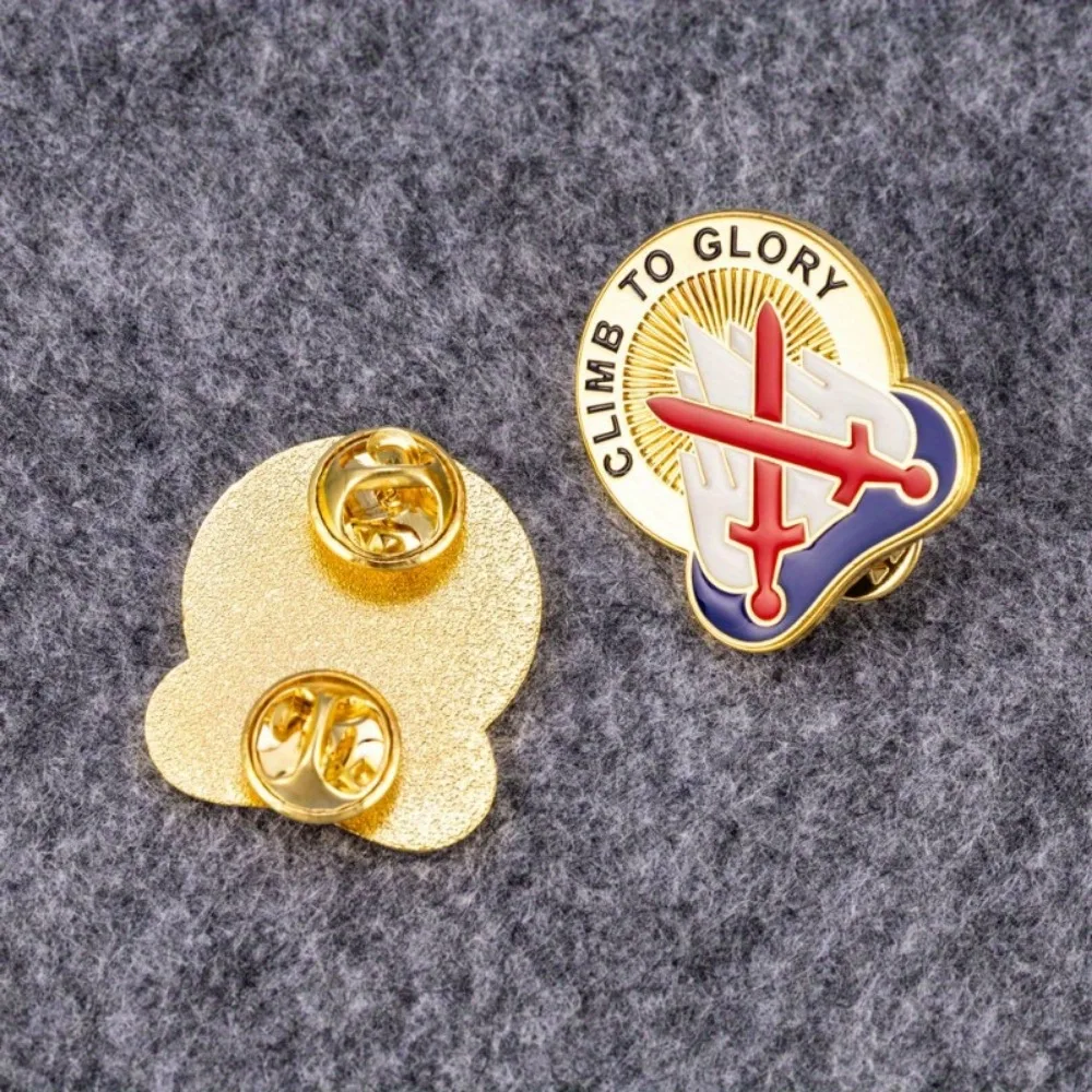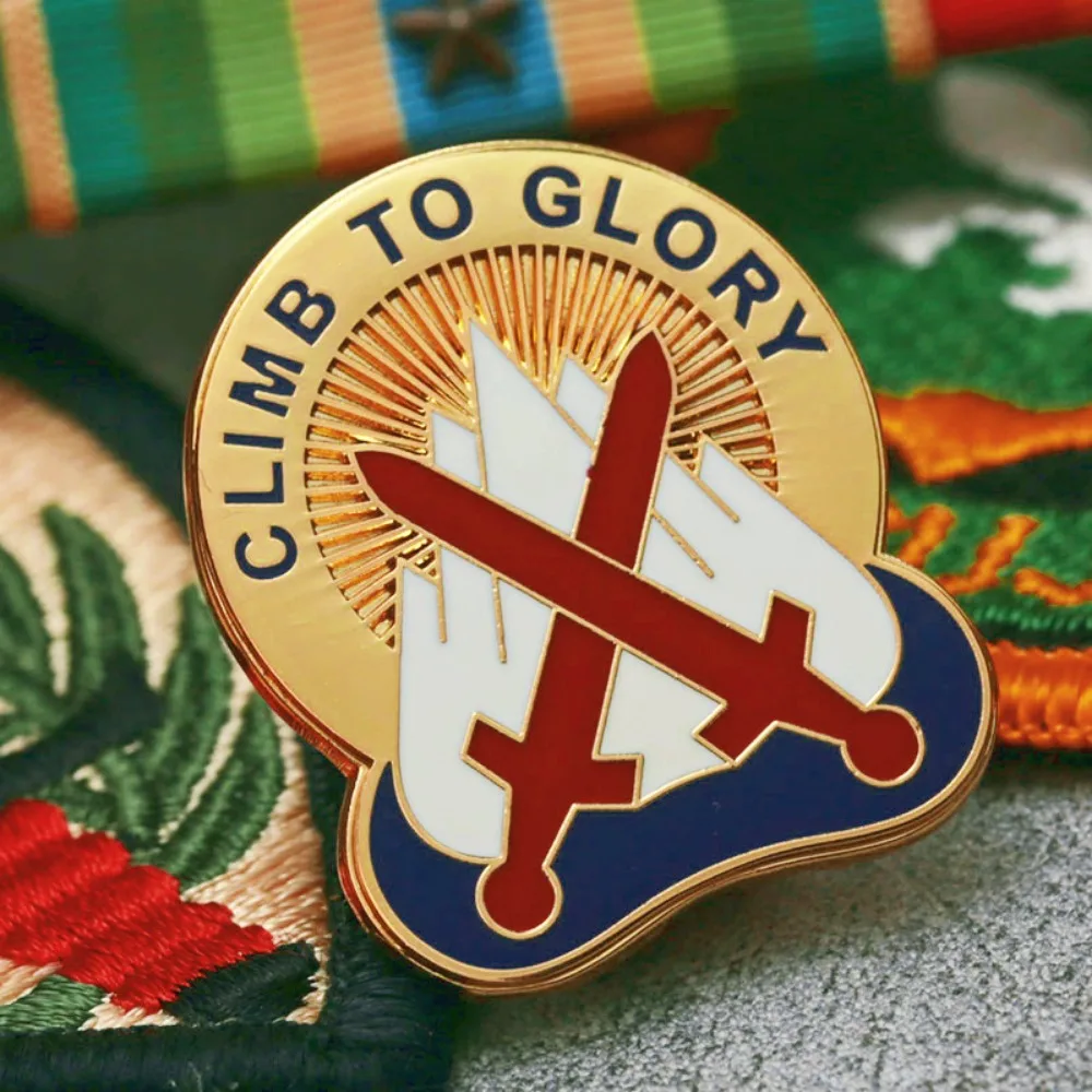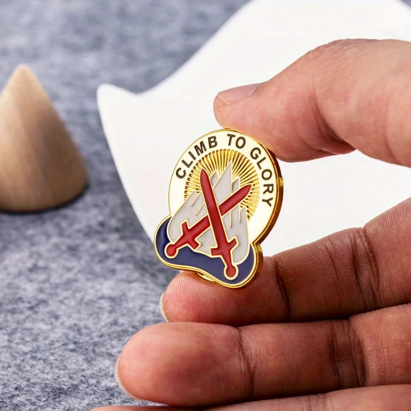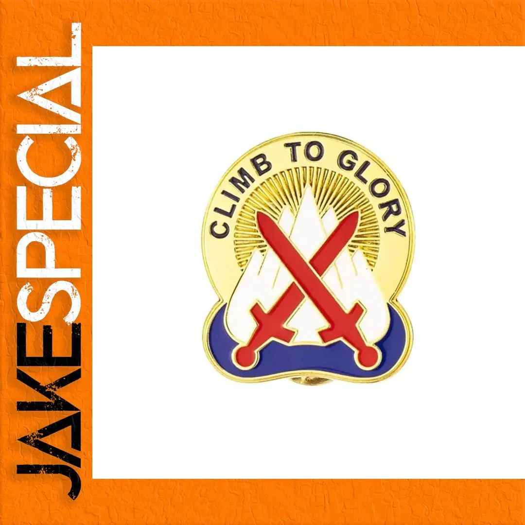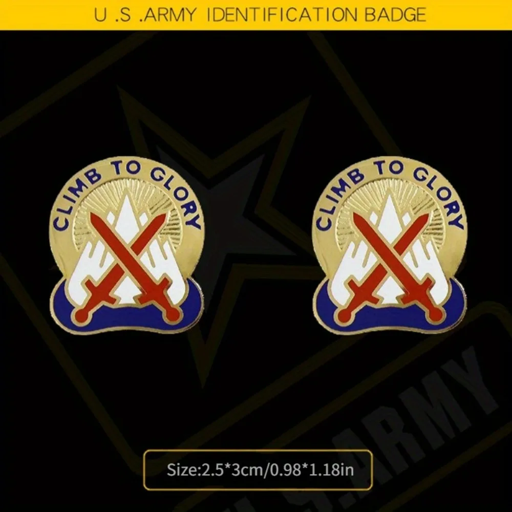The 10th Mountain Division Unit Crest Badge, themed “Climb To Glory,” is a striking military commemorative piece crafted from durable alloy metal. Measuring approximately 2.5 cm in height and 3 cm in width, this shiny golden badge features two vibrant red crossed swords against stylized white mountains, symbolizing strength. A bold sunburst design radiates from the center, complemented by the inspirational phrase “CLIMB TO GLORY” in capital black letters encircling the top. The deep blue wave-like design at the bottom adds visual interest. Weighing just 8 grams, this lightweight badge is perfect for parties, casual outings, or as a decorative accessory.