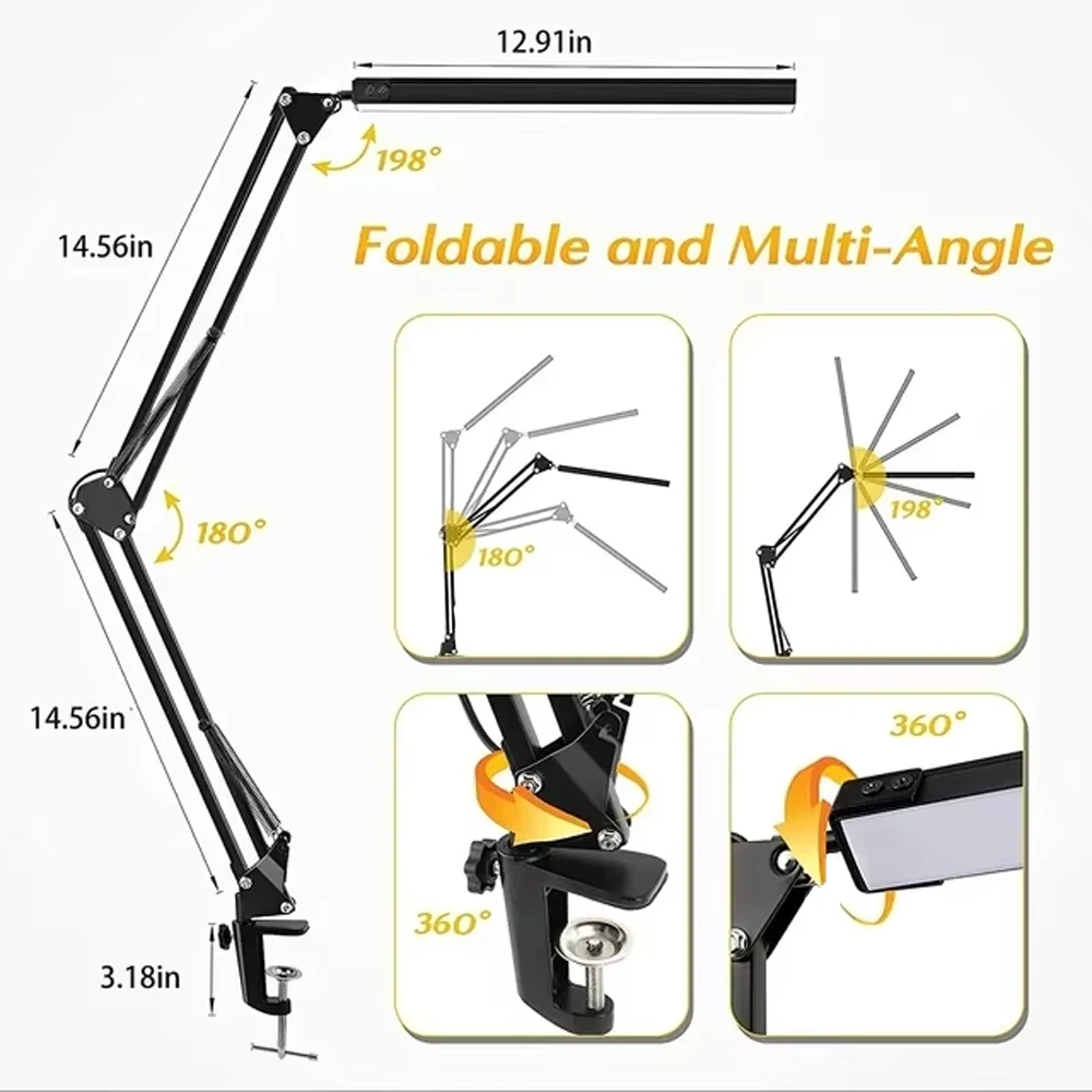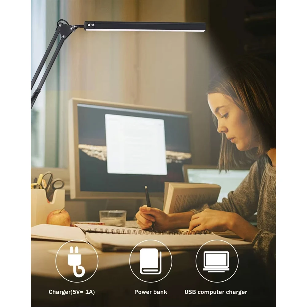 Elevate your workspace with this 10W LED desk lamp that combines modern aesthetics with exceptional functionality. Featuring an elongated rectangular head, it offers three lighting modes—cold light (6500-7000K), natural light (4500-5500K), and warm light (3000-3200K)—allowing you to tailor the ambiance to your needs. The lamp includes a dimmable function with 10 brightness levels, ensuring optimal eye care during prolonged use. Its versatile swing arm design and sturdy clamp base enable easy adjustment and secure attachment to any surface. Available in sleek black, it seamlessly fits into any home or office décor.