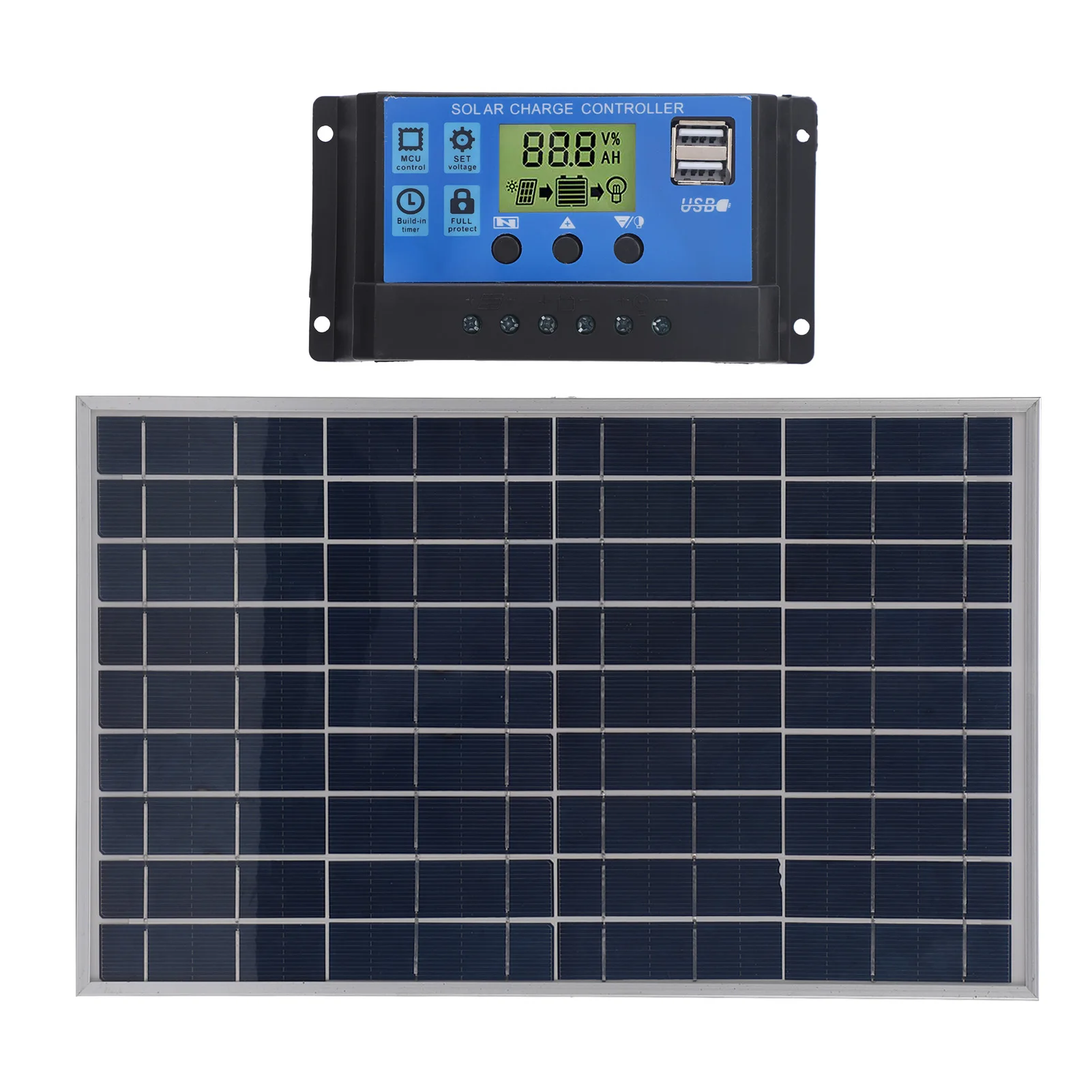 Experience reliable outdoor power with this compact 10W, 12V polycrystalline solar panel set, featuring an IP65 waterproof rating, measuring approximately 33 x 20 x 1.6 cm and weighing 450 grams. The system includes a 30A solar charge controller capable of handling a maximum current of 0.8A, with a 13.8V open circuit voltage and a maximum power output of 10W. Designed for outdoor use, it offers comprehensive protection against overcharging, over discharging, overvoltage, overcurrent, short circuits, and reverse polarity. Perfect for camping, hiking, or emergency situations, this durable setup combines efficiency and practicality for your portable power needs.
