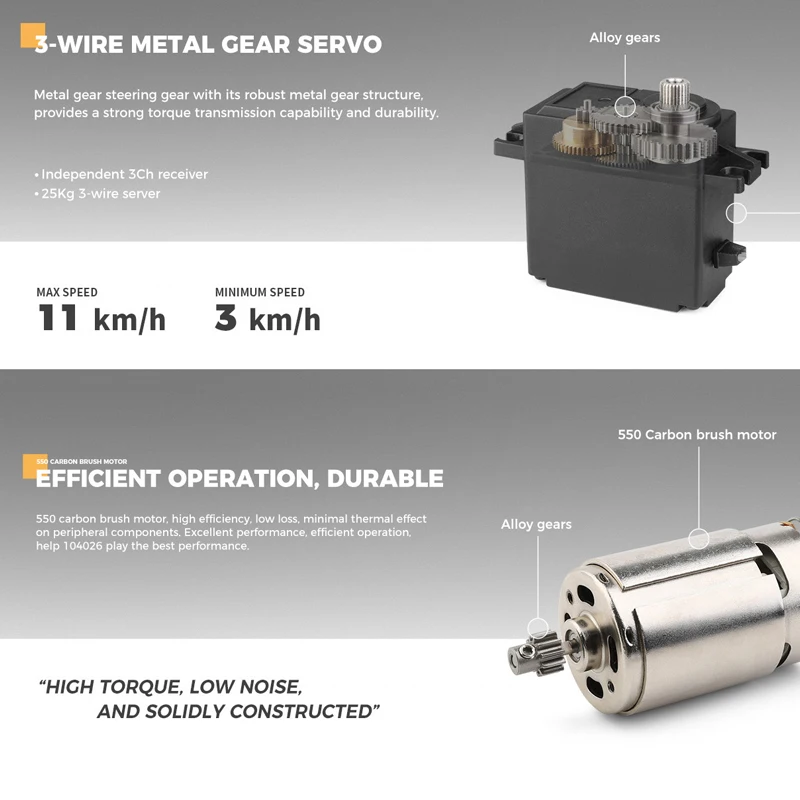 - Powered by a high-performance 7.4V 3000mAh 18650 lithium battery and a 550 high-torque motor delivering 11 km/h high speed.