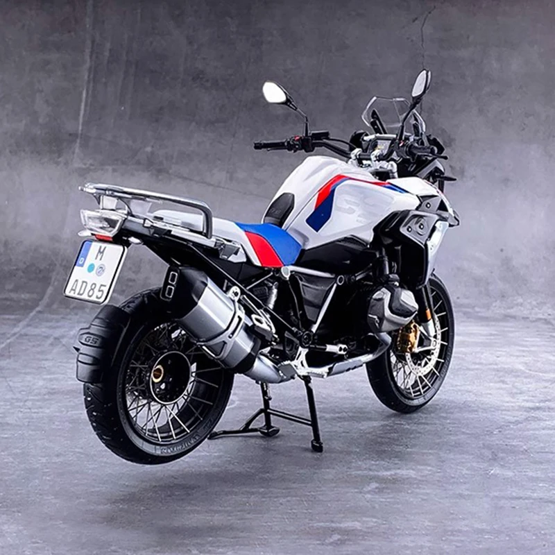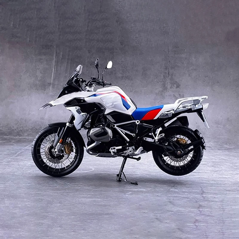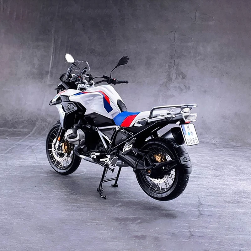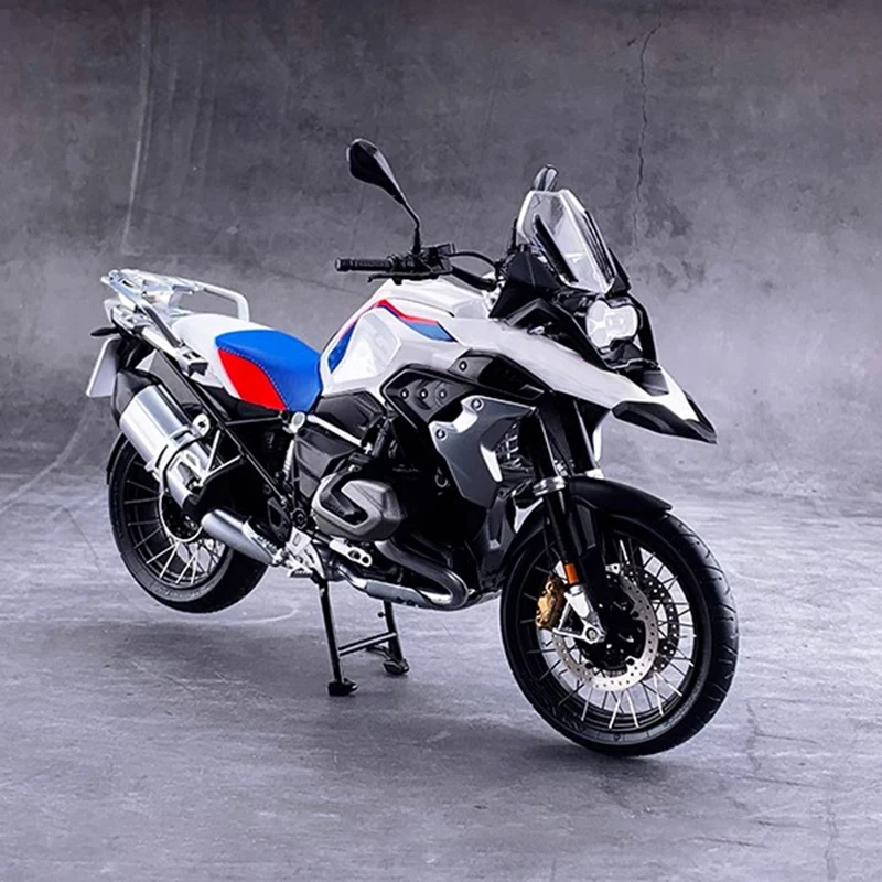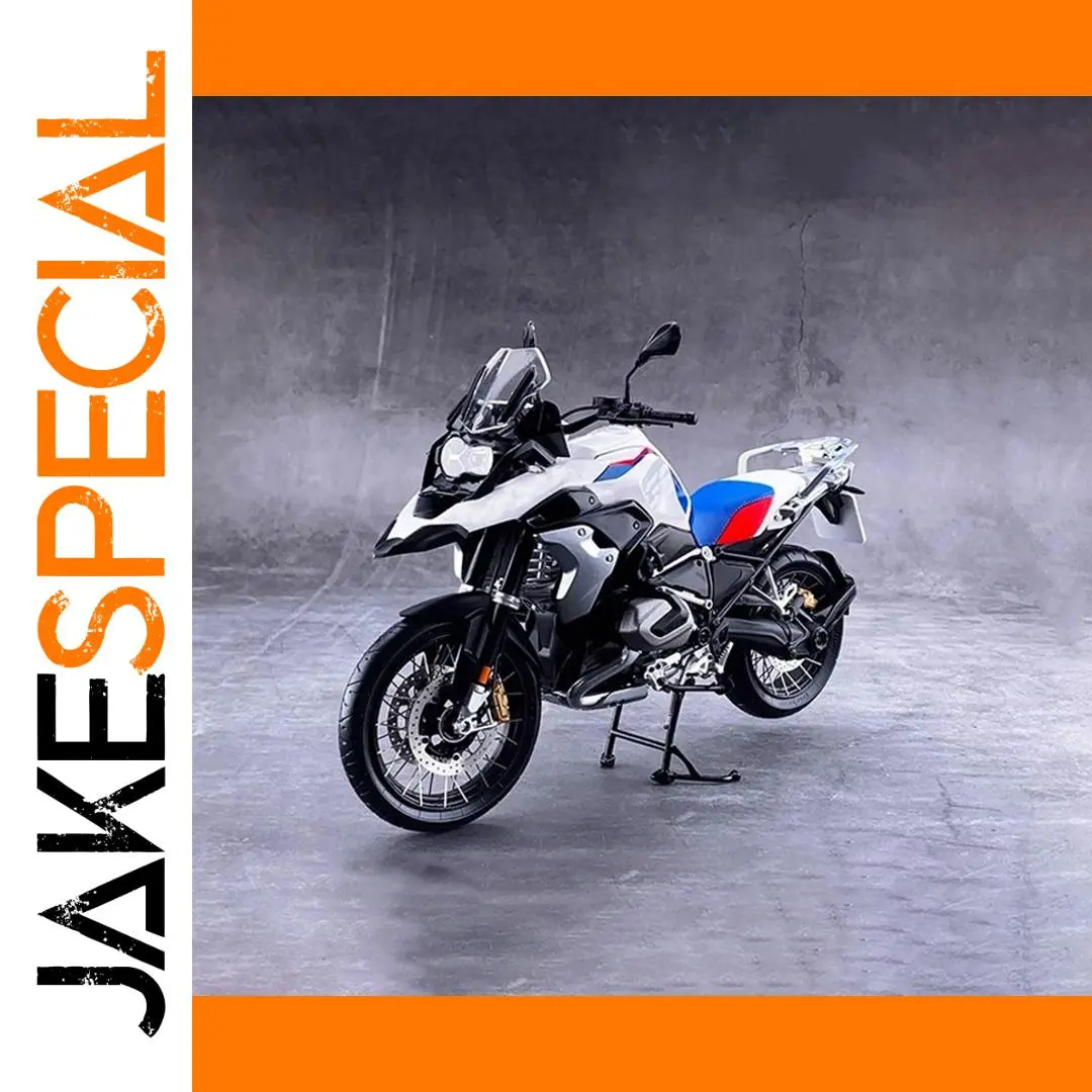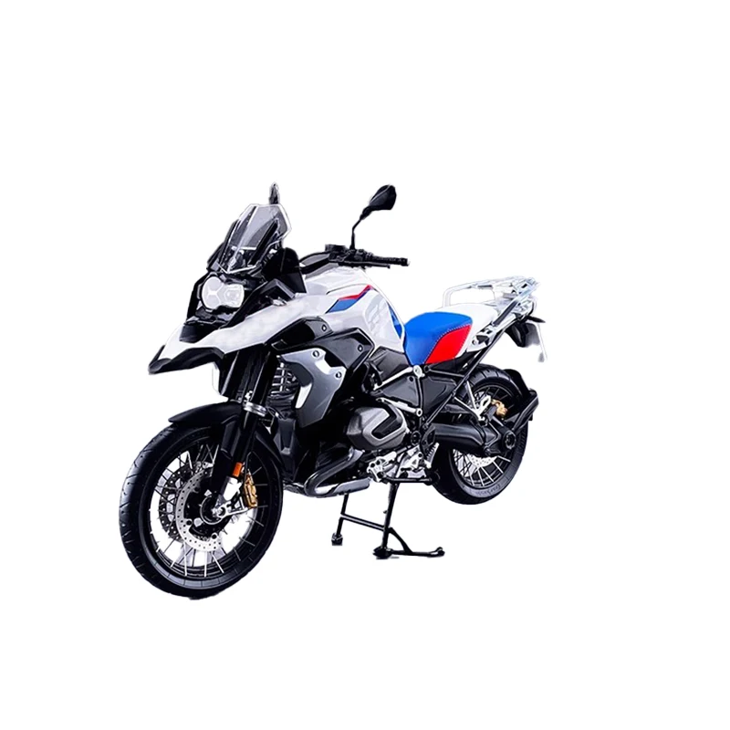 Experience the thrill of owning a lifelike replica with this highly detailed 1:10 scale motorcycle model. Designed to showcase a modern, sporty aesthetic, this model features a sturdy zinc alloy body complemented by plastic and rubber components for an authentic look and feel. The sleek white color, accented by blue and red stripes, highlights its edgy, racing-inspired style. Its streamlined contours and sharp lines perfectly capture the essence of a high-performance adventure or sports motorcycle. The model's functional front wheels can turn for an interactive viewing experience, making it an eye-catching display piece. Sized at approximately 18 x 5 x 11 cm, this static model is ideal for enthusiasts and collectors alike.
