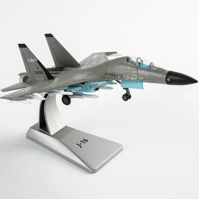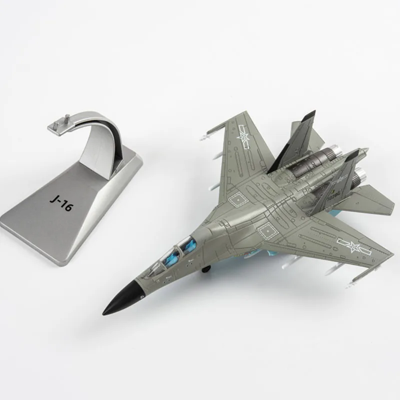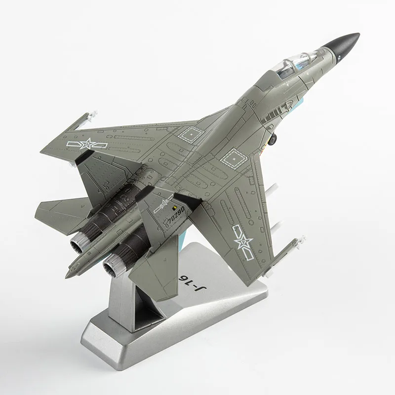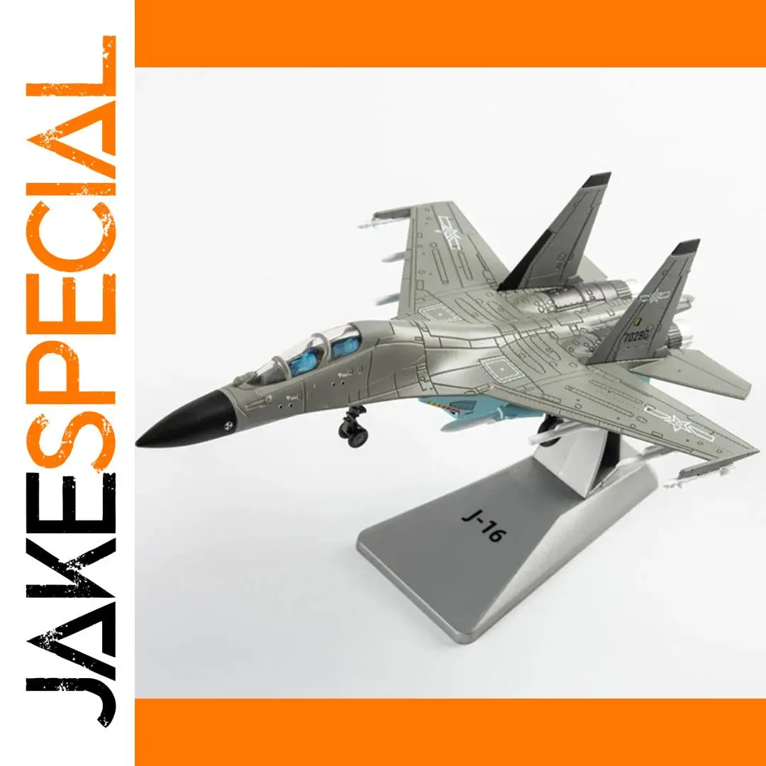 - Designed as a diecast collectible with a stable base labeled “J-16,” supporting the aircraft in an angled flying stance for an eye-catching presentation.