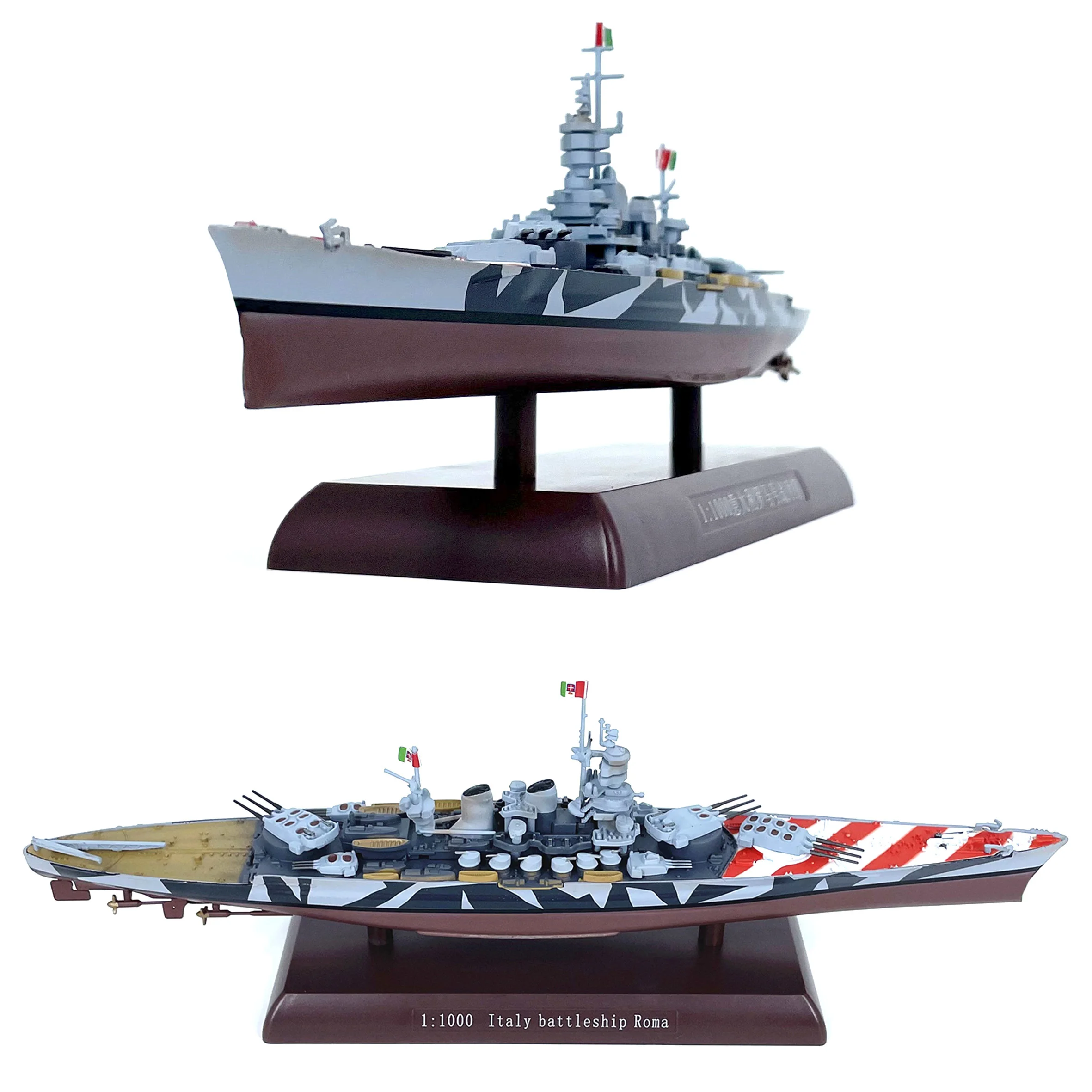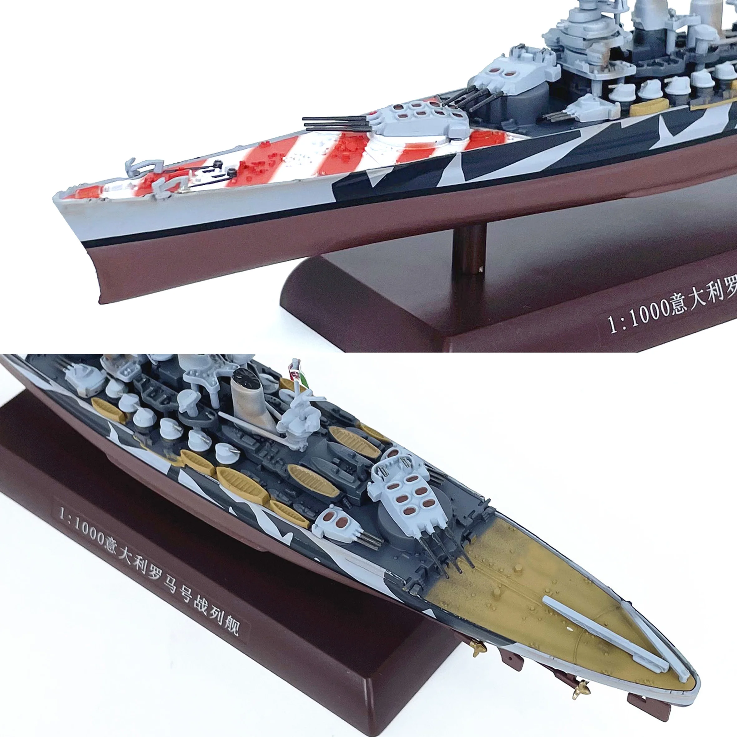 This meticulously crafted 1:1000 scale model of a World War II Italian Roman battleship is designed for the discerning collector. It showcases a long, slender hull made from durable alloy, giving it a striking metallic appearance. The lighter ABS plastic superstructure enhances the model's design while adding intricate details, such as weaponry and turrets, that reflect real naval architecture. The color scheme is a delightful blend of gray and gold, with a bold red and white striped pattern adorning the bow, making it an eye-catching centerpiece. Measuring 23.8 cm in length, 3.2 cm in width, and 6.2 cm in height, it offers a compact yet detailed display option you will surely admire.