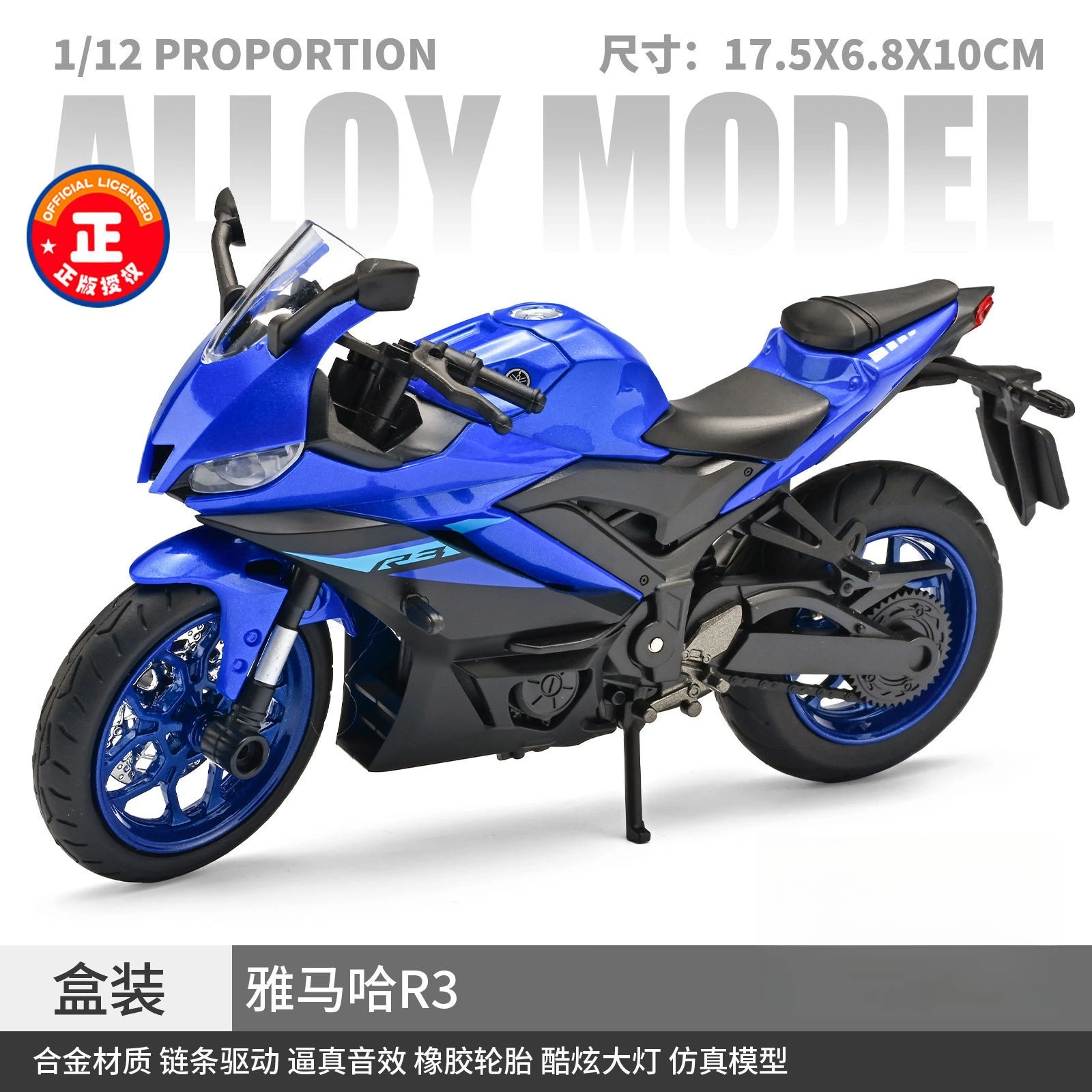 Bring the thrill of racing into your collection with this highly detailed 1:12 scale alloy racing motorcycle model. Crafted with precision die-cast construction, it captures every aerodynamic curve and sharp line of a street sports motorcycle. The vivid glossy blue finish makes it stand out on display, complemented by black accents on the engine, seat, and various intricate details. The realistic wheels feature matching blue rims and textured black rubber tires, while black suspension components add depth. Additional features such as mirrors, handlebars, and a clear windscreen enhance authenticity. Equipped with simulated sound and light effects activated by a button cell, this model provides dynamic visual and auditory realism. Perfect for passionate enthusiasts aged 14+ or as a striking decorative piece.