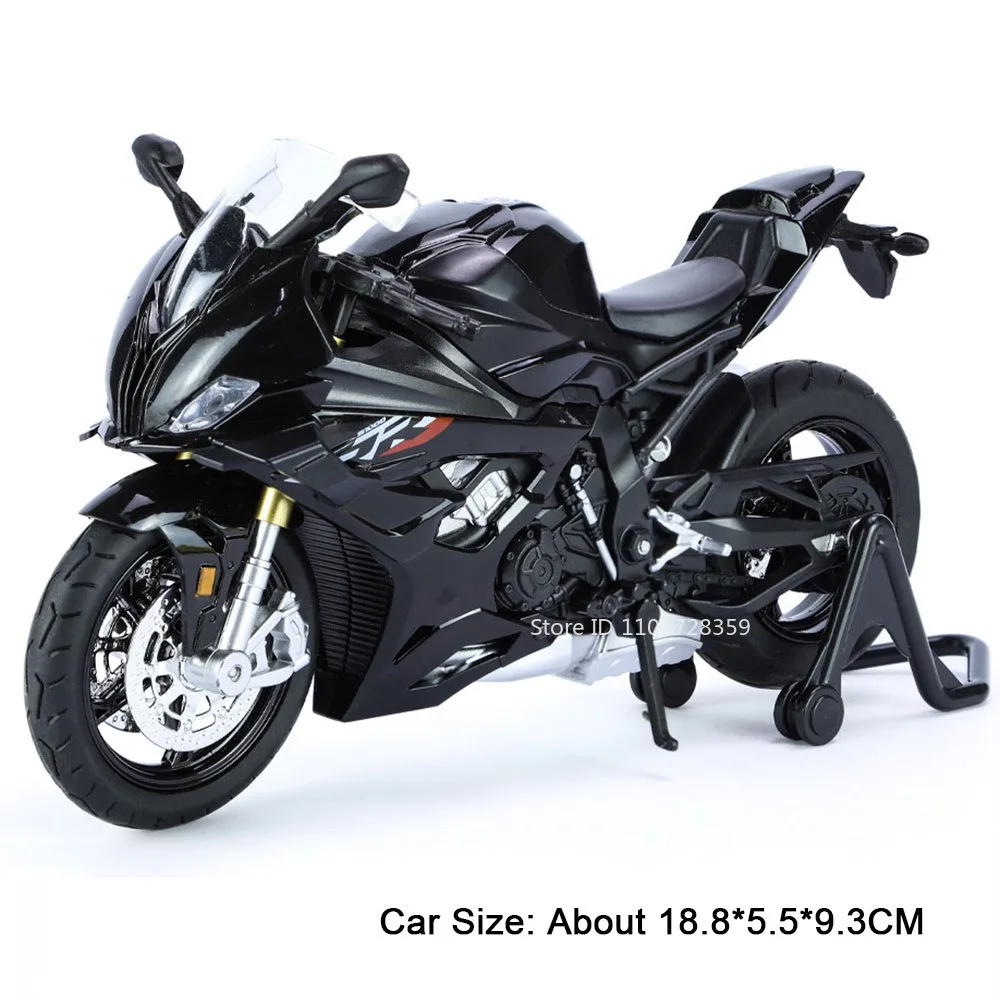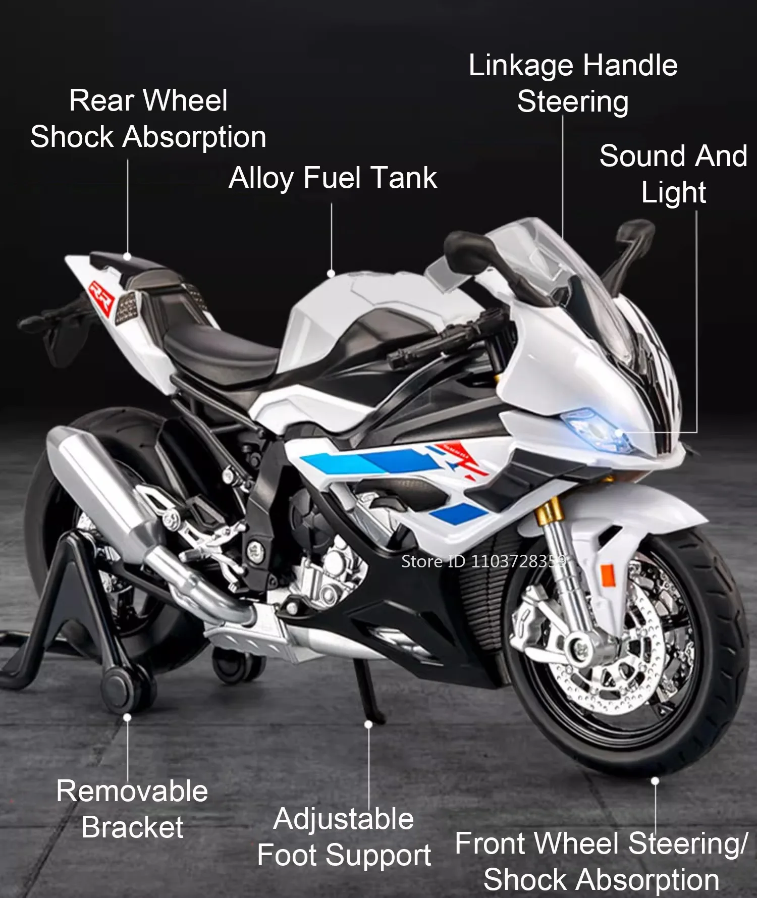 Experience the realism of the 1:12 scale BMW R1250 GS motorcycle model, crafted with a durable metal alloy body, plastic chassis, and rubber tires featuring shock absorption for lifelike detail and durability. Measuring approximately 18.5 x 7.7 x 12 cm, available in sleek silver, vibrant blue, and classic black, this high-precision model includes front wheel steering, a retractable adjustable tripod support frame, and intricate detailing mimicking a real motorcycle. It offers an engaging display piece or a collectible for enthusiasts aged 14 and above, combining craftsmanship with authentic features to elevate your collection and showcase your passion for motorcycles.