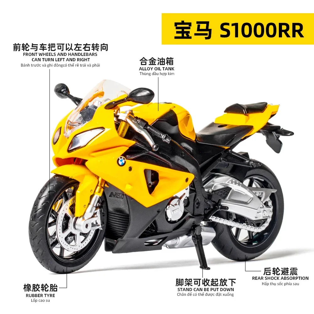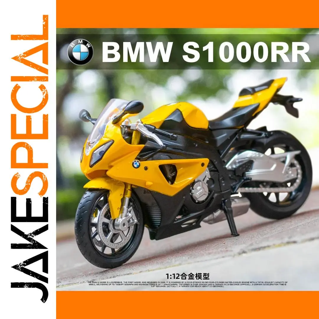 Immerse yourself in the stunning realism of this 1:12 scale BMW S1000RR diecast model motorcycle, crafted with intricate attention to detail. Featuring a vibrant yellow finish accented with sleek black components, this model exudes sporty elegance and high-energy style. From the aerodynamic fairings and streamlined windshield to the side-mounted mirrors and textured black seat, every element mimics the look of the actual racing motorcycle. The front wheel showcases black spokes, a silver hub, and a detailed disc brake, while the engine components are rendered in a metallic silver tone, adding mechanical authenticity. With its precise alloy construction and realistic textures, this model makes a perfect collectible or display piece for enthusiasts and collectors alike.