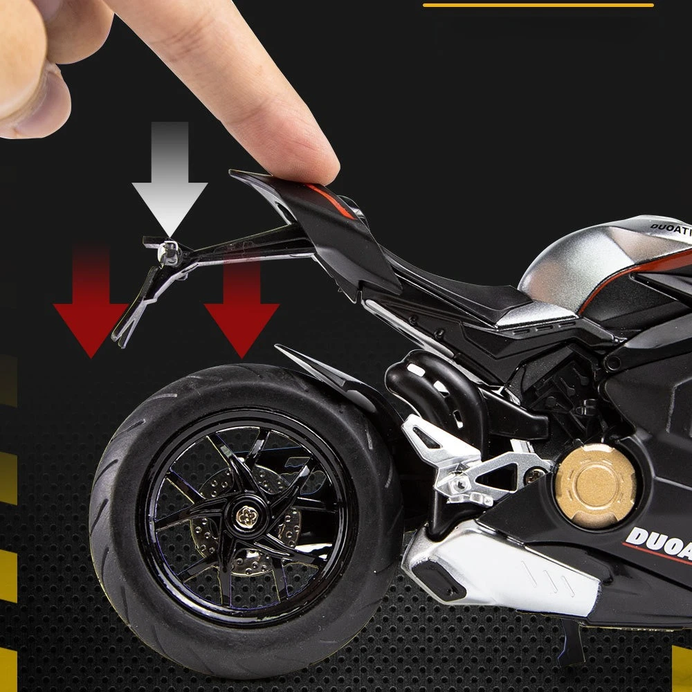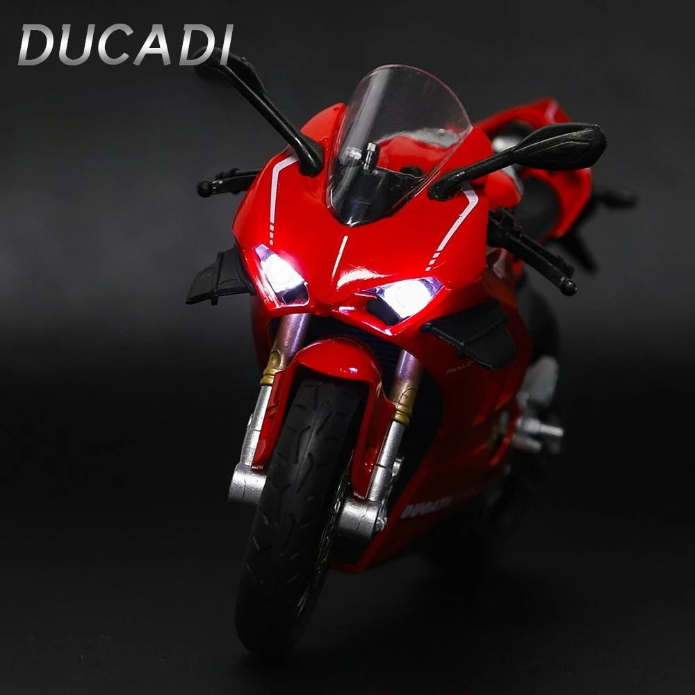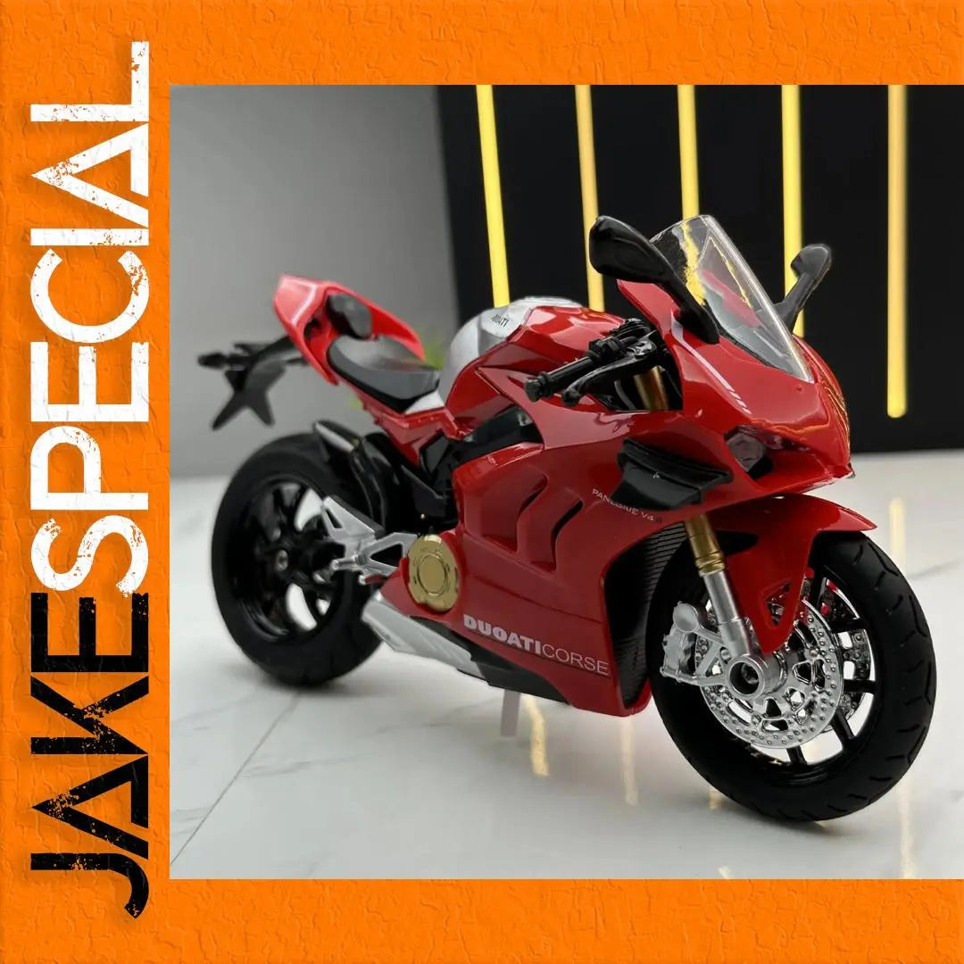 Immerse yourself in the intricate details of this stunning 1:12 scale Ducati V4S Alloy Motorcycle Diecast Model, designed for collectors and enthusiasts alike. The vibrant red finish captures the essence of the real sports bike, showcasing a glossy, well-polished exterior. Crafted from durable metal, it not only enhances the realistic appearance but also promises longevity. Chrome accents on the exhaust and engine components, paired with realistic wheels, make this model a true standout. Enhance your collection with a piece that brings this iconic motorcycle to life in miniature form, featuring working lights and sound powered by a button battery.