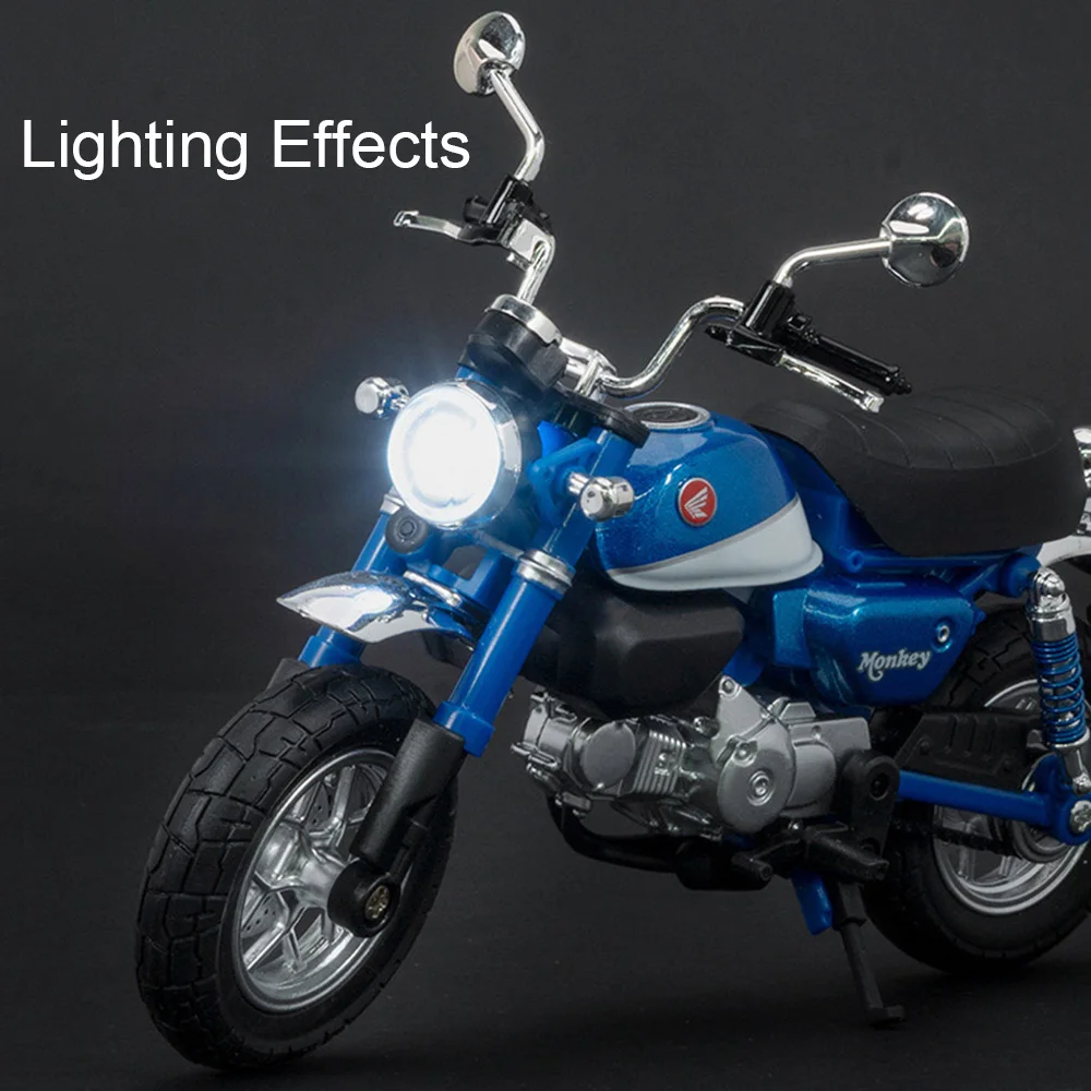 Bring home this highly detailed 1:12 scale replica of the Honda Monkey or CB400F motorcycle, perfect for collectors or enthusiasts who want to showcase their passion. Crafted with a sturdy metal body, this model features vibrant color options including blue, yellow, red, silver, and black, capturing the authentic look of the original bikes. Its functional design includes working light and sound effects, front wheel steering, and rear wheel suspension, adding to its realism. The rubber tires with realistic tread pattern and silver alloy rims further enhance the model’s lifelike appearance. Compact yet intricately detailed, this miniature motorcycle offers stability and durability, making it an impressive display piece or a fun, interactive toy for those aged 14 and above.