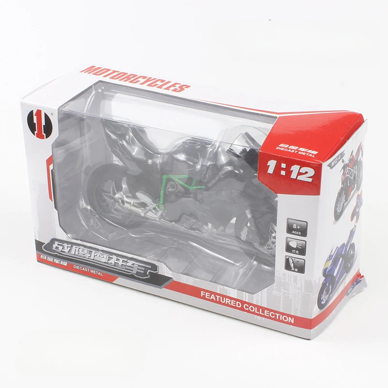 The 1:12 scale model of the Kawasaki H2R motorcycle boasts a sleek matte black finish with vibrant green highlights and aggressive aerodynamic styling. Made of alloy and plastic, it features realistic details such as shock absorbers, visible exhaust pipes, intricately designed chrome-like rims, and a textured leather-like seat. The model also includes sound and light functionalities, with striking blue headlights enhancing its lifelike appearance. This diecast toy is designed for collectors, presenting a high-tech, sporty aesthetic that makes it an impressive display piece. Available in black and silver variants, both with and without a box, it provides an engaging experience for enthusiasts.
