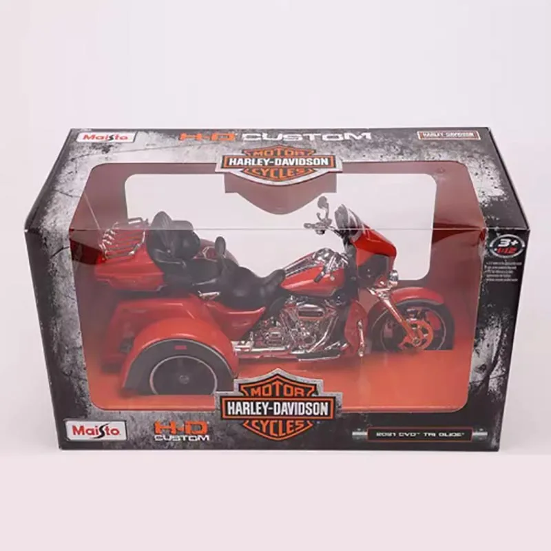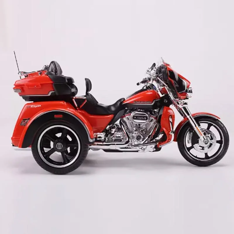This exceptional 1:12 scale diecast model of the 2021 CVO TRI Glide motorcycle is designed for collectors who appreciate intricate detail. Its vibrant red body, accented with sleek black elements, captures the essence of this iconic motorcycle. Featuring meticulously crafted parts, including dual round headlights integrated into the front fairing, it stands out on any display. Upholstered black seats add a touch of sophistication, while the multi-spoke black wheels with textured tires provide realism. Constructed from a combination of alloy and plastic, this model is durable yet lightweight, making it an exquisite addition to your collection or a perfect gift for hobbyists.