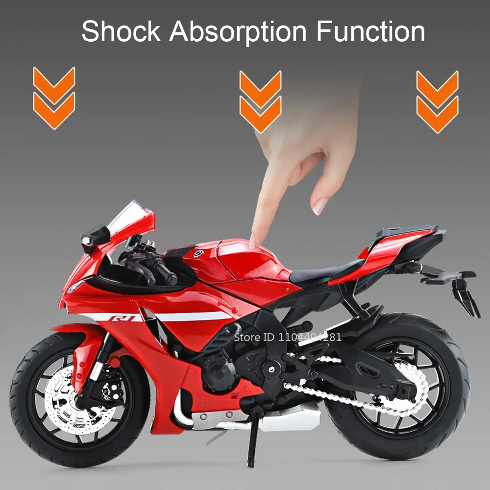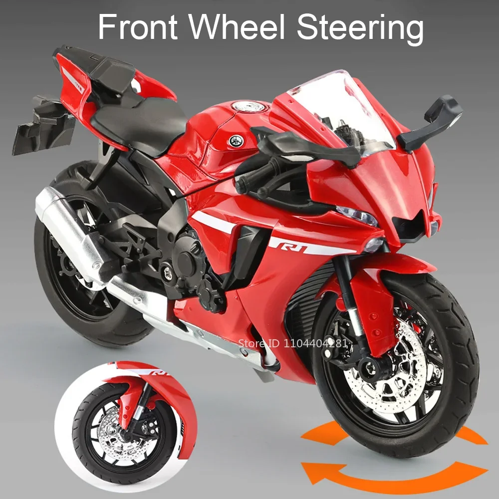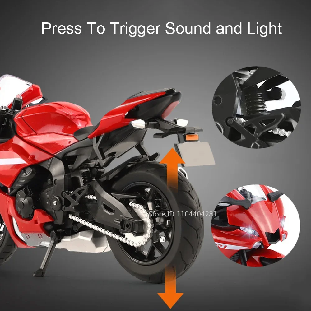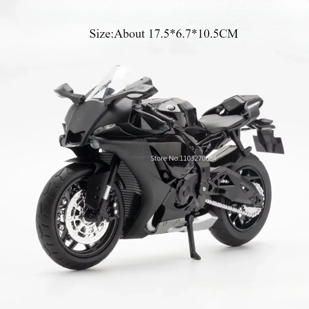 Imagine showcasing this beautifully crafted 1:12 scale diecast alloy motorcycle in your collection or as a striking display piece. Its sleek lines and aerodynamic contours replicate a high-performance sportbike, capturing detailed accents like shiny metallic wheels, a vibrant glossy blue or elegant black and white finishes, and realistic rubber tires. The clear plastic windshield and sharply designed fairings give it a modern, futuristic appearance. With functional features such as opening doors, pull-back mechanism, integrated lights, and sound, this model feels alive and ready to impress. Constructed with durable metal and plastic materials, it offers both aesthetic appeal and long-lasting quality. Perfect for collectors, enthusiasts, or as a unique gift for any motorcycle lover eager to own a striking replica.