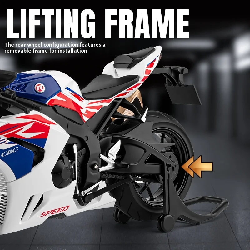 Experience the thrill of motorcycle modeling with this exquisite 1:12 scale CBR1000 motorcycle model, crafted from durable metal for longevity. Showcasing a vibrant red color scheme accented by striking blue and white details, this model captures the essence of sportiness and style. The sleek angular front fairing features an aerodynamic windscreen, while the aggressive headlights enhance its futuristic look. Detailed front and rear fenders, metal alloy wheels with realistic tread tires, and a well-defined sporty black frame complete the authentic appearance. Perfect for desktop display, this stunning model is ideal for car enthusiasts looking to enhance their collection.