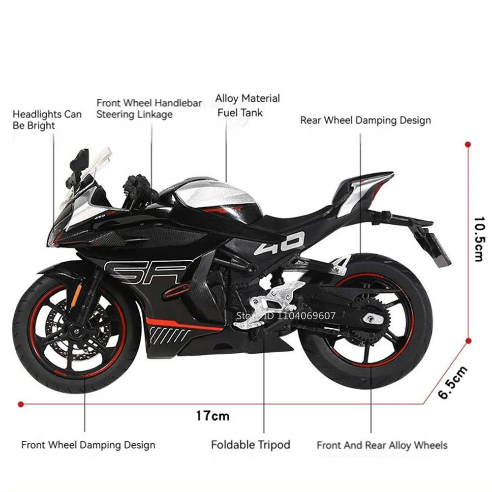 Experience the thrill of authentic motorcycle craftsmanship with this meticulously designed 1:12 scale CFMOTO model. Crafted with a durable metal body and plastic chassis, this high-simulation toy captures the sleek, aggressive aesthetics of the real R1M and 450SR bikes. Its aerodynamic contours, striking color options, and intricate detailing, including realistic tires and shock absorption wheels, bring the model to life. With functional features such as front wheel steering connected to the handlebars, sound effects, and turn-on headlights, it invites you to imagine racing across road surfaces. Compact yet highly realistic, this model is not just a collectible but a perfect display piece for enthusiasts. Its thoughtful construction and attention to detail make it a true replica that ignites passion for motorcycle racing.
