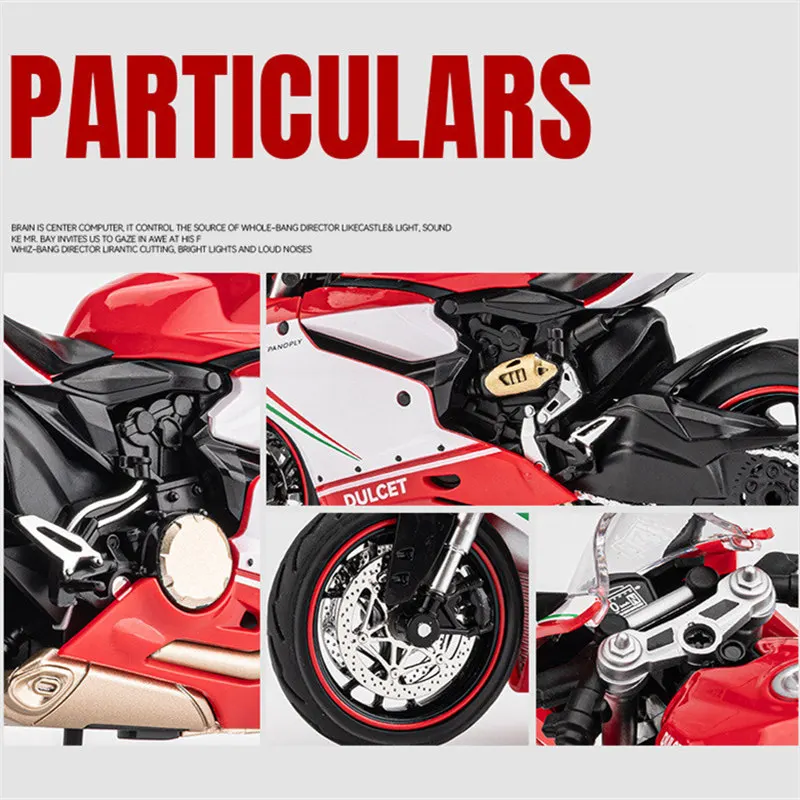 The 1:12 scale diecast model of the 1199 Panigale racing motorcycle features a striking red body with white and green accents, reflecting classic racing design. Made from durable alloy and plastic, this model showcases intricate details including illuminated headlights, realistic tires with visible brake discs, and a sleek seat that mimics real motorcycle seating. It does not require batteries and includes sound and light effects, enhancing its appeal. Additionally, the model incorporates mechanical elements like chain, gear, and suspension components, making it a perfect collectible for enthusiasts and a visually stunning representation of a high-performance motorcycle.