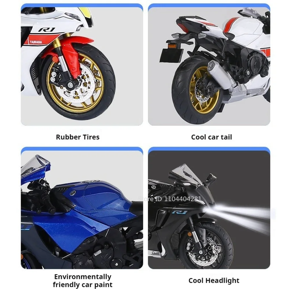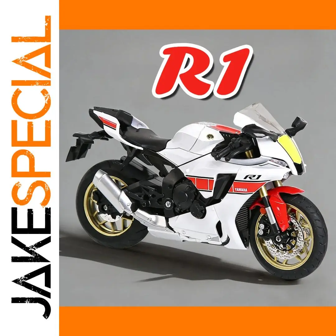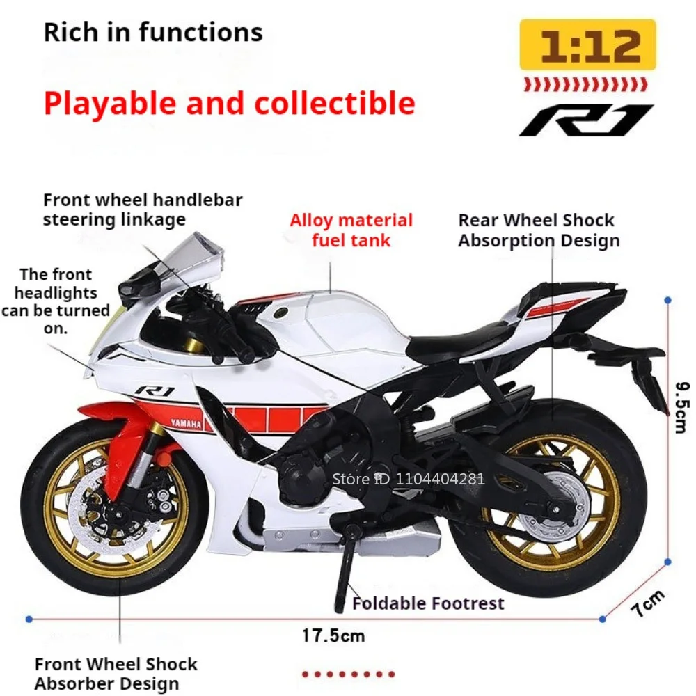 Experience the thrill of high-performance racing with this meticulously crafted 1:12 scale diecast alloy motorcycle model. Designed to capture every aerodynamic detail, it features a sleek white body accented with bold red and black graphics, giving it a dynamic and modern appearance. The transparent windshield and sharply contoured front fairing replicate real racing bikes, enhancing realism. The vibrant yellow strip on the front adds a lively touch. Equipped with rotating front wheels and a functional rear suspension, this model offers an authentic riding experience. Its durable alloy body and rubber tires ensure longevity. Ideal for collectors and enthusiasts alike, this model elevates any display with its impressive craftsmanship and eye-catching design.