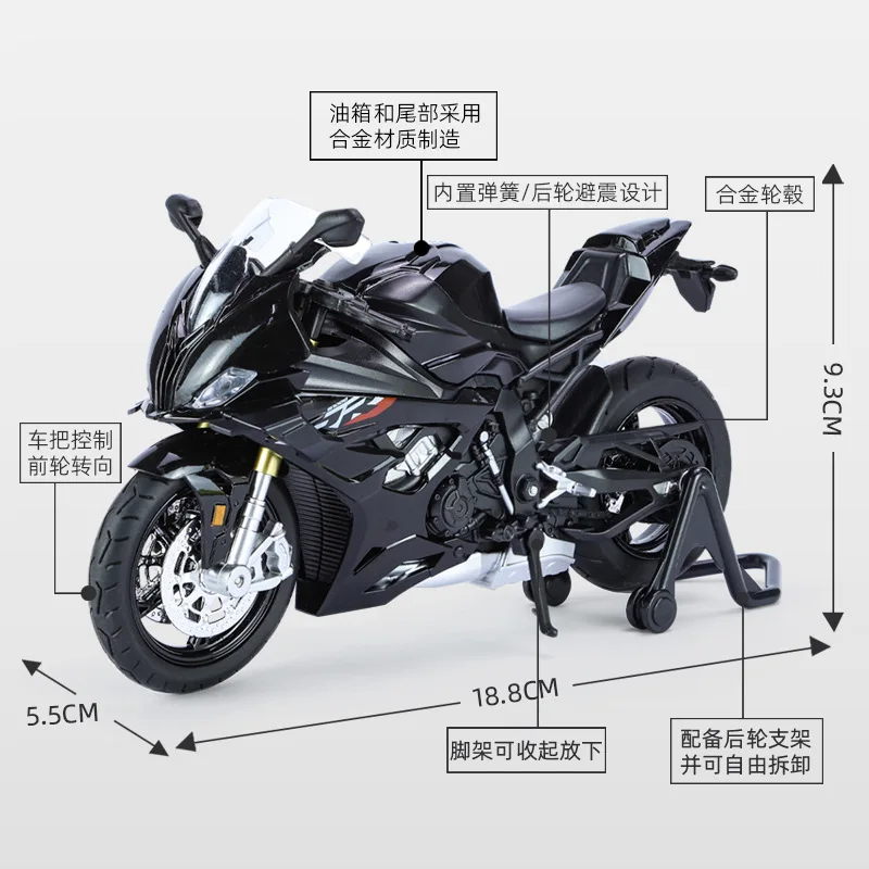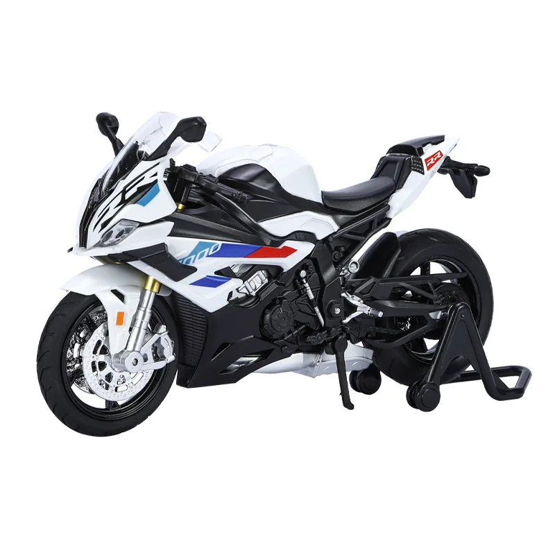 The 1:12 scale diecast model motorcycle showcases a striking design with a crisp white body accented by sleek black details and vibrant red and blue decals. Constructed from durable metal, it features intricate detailing on the headlights, mirrors, and engine components, enhancing its realism. The model includes robust tires with realistic tread patterns and a smaller front wheel showcasing a visible disc brake. Notably, this model incorporates sound, light, and echo effects but is not electric and does not require batteries. Perfect for collectors and motorcycle enthusiasts, it represents a finely crafted decorative gift.