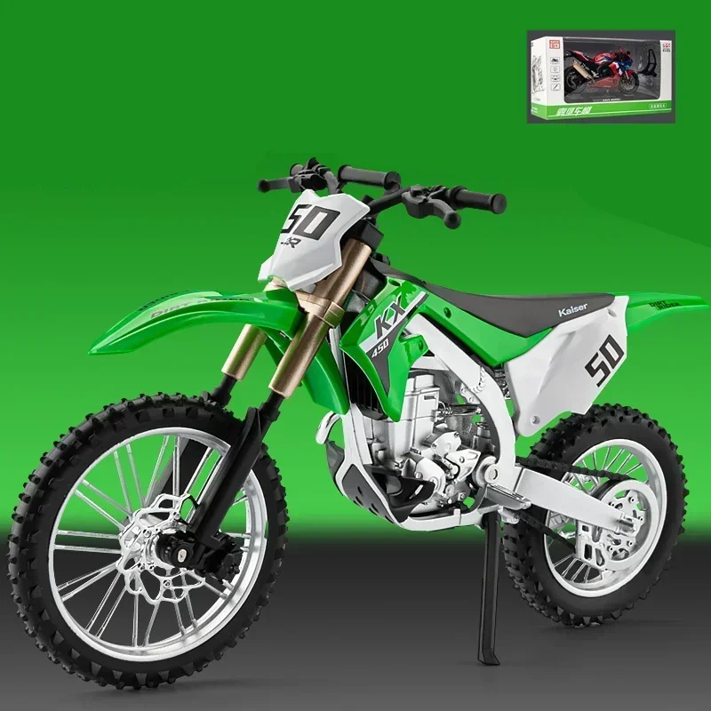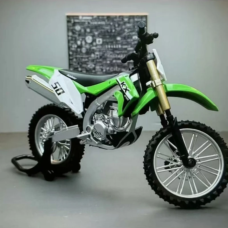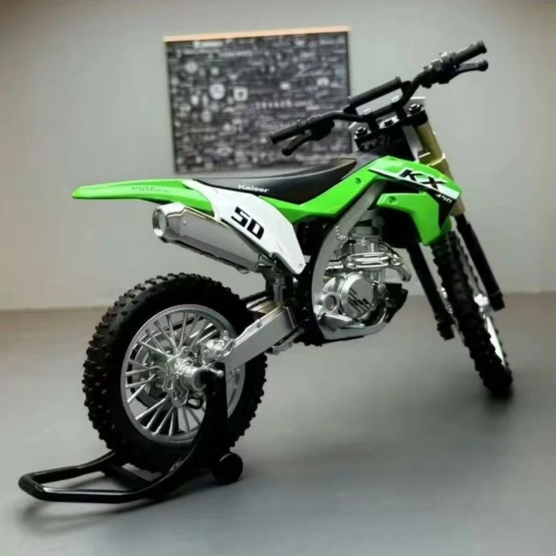 Imagine adding the stunning 1:12 scale Kawasaki KX450 motorcycle model to your collection. This exquisite diecast model captivates with its vibrant green finish, smooth aerodynamic lines, and racing aesthetics. The white number plate prominently displaying “50” adds further to its sporty charm. Crafted from a combination of metal and plastic, this durable piece showcases intricate details, including engine components and a lifelike exhaust design, highlighting the craftsmanship behind it. Whether you're a collector or simply appreciate fine models, you'll find joy in displaying this piece on its sturdy stand. Elevate your space with this remarkable representation of the iconic Kawasaki KX450.