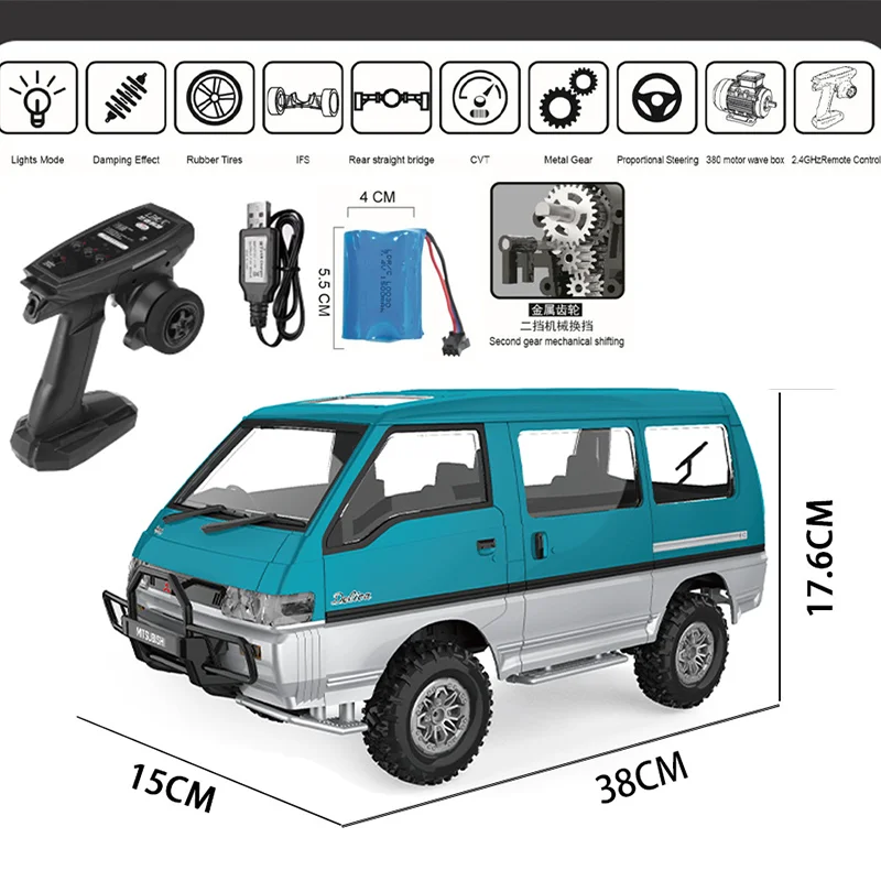 Experience the thrill of off-road adventure with this detailed 1:12 scale RC vehicle modeled after a Mitsubishi Delica, featuring a vibrant turquoise and silver two-tone exterior. Equipped with a dual-speed 380 motor gearbox with metal gears and planetary gear reduction, it offers enhanced performance and handling. The vehicle boasts four-wheel drive, front independent and rear straight axles, rubber-reinforced soft tires on black multi-spoke wheels, and a durable chassis with spring shock absorption and four-bar linkage suspension. Powered by a 1200mAh battery providing 20 to 30 minutes of run time, it operates with a 2.4GHz three-channel remote control with a 20-meter range, making it perfect for rugged outdoor off-road exploration.