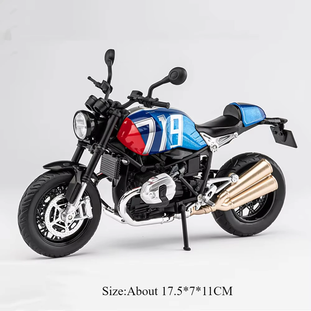 Immerse yourself in the world of high-performance motorcycles with this meticulously crafted 1:12 scale diecast alloy model by MAKEDA. Designed for enthusiasts and collectors alike, this model captures the sleek aesthetics and dynamic details of the Yamaha R NineT and CFMOTO 450SR. Its durable metal body features a striking black finish with a perfect mix of matte and gloss surfaces, complemented by subtle red accents and linear patterns that enhance the sporty appeal. The intricate fairing, transparent windshield, and realistic side mirrors add depth and authenticity. With functional light and sound features, this model not only looks spectacular but also provides an immersive experience. Ideal for display, collection, or as a dynamic gift for motorcycle lovers.