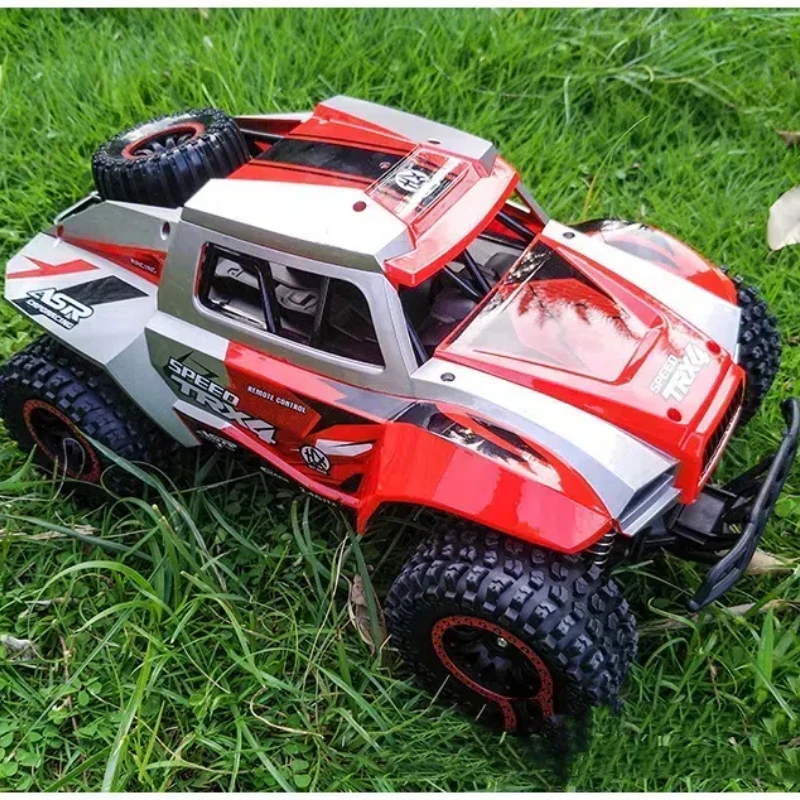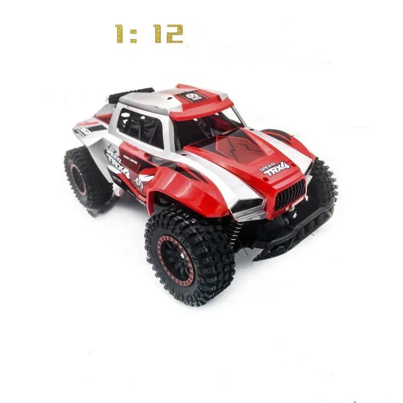 Experience the thrill of off-road racing with this 1:12 scale high-speed remote control car, featuring a rugged design with large, heavily treaded tires ideal for drifting and tough terrains. Crafted from durable ABS material, it comes in sleek black and vibrant red colors, with angular, aerodynamic styling accents, blue decals, and a reinforced chassis for enhanced durability. The vehicle boasts a remote control range of 35 meters and offers approximately 20 minutes of flight time on AA batteries (not included). Its ready-to-use design, steering and throttle servos, and off-road-ready features make it perfect for hobbyists seeking high-speed adventure and technical sophistication.