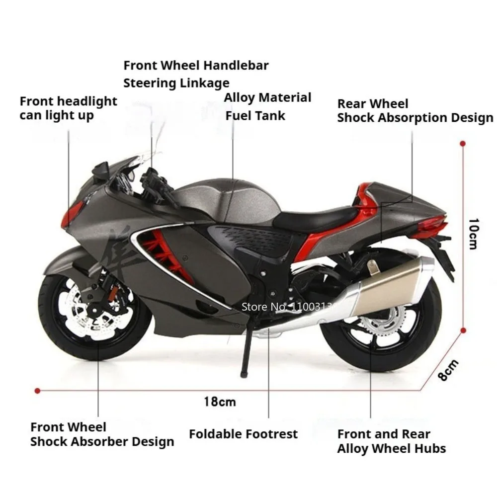 Experience the thrill of high-performance with this highly detailed 1:12 scale motorcycle model available in various colors, including red (CB650), silver gray (CB650), and iconic Hayabusa shades of black, gray, and white. Crafted with a zinc metal body, plastic chassis, and rubber tires, this model measures approximately 18 cm in length, with the Hayabusa reaching about 10 cm high and 8 cm wide, and the CB650 around 10.5 cm high and 7.7 cm wide. It features front wheel steering, sound and light effects, rear wheel shock absorption, and is designed for durability. Batteries are included for immediate use, making it an engaging collectible perfect for enthusiasts aged 14 and up.