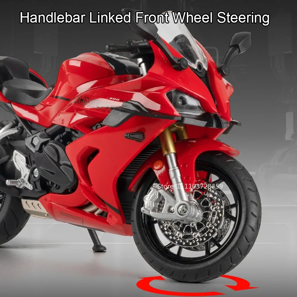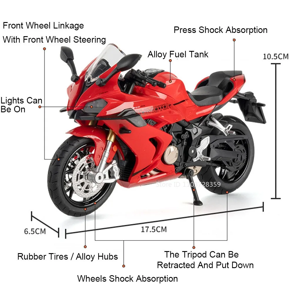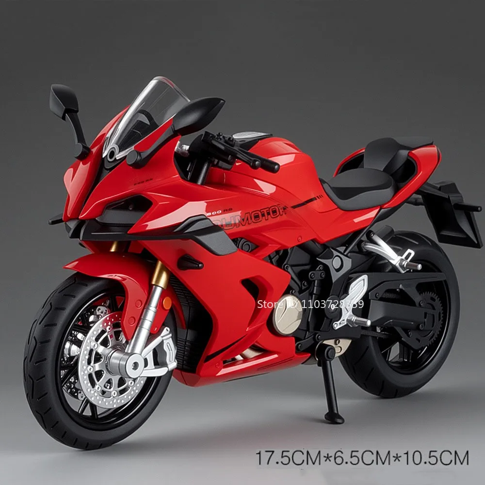 Experience the thrill of a high-performance motorcycle with this 1:12 scale model, crafted from a durable metal body, plastic chassis, and rubber tires. Measuring approximately 17.5 x 6.5 x 10.5 cm for the 600RS model and 17 x 6.5 x 10.5 cm for the 450SR, this detailed replica features shock-absorbing wheels, a movable handlebar linked to the front steering, and a retractable tripod stand. Its sleek design is enhanced by realistic light effects activated with a push of a button, and the vivid color options—black, red, and white—allow you to select your preferred style. Perfect for collectors, this model combines exquisite craftsmanship with functional features for an authentic motorcycle experience.