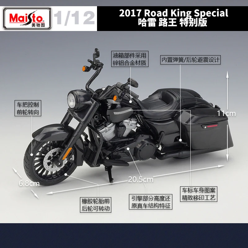 - This model’s dimensions are precisely scaled at 1:12, faithfully reproducing the size and detail of the real-life Road King Special motorcycle for display or gifting.
