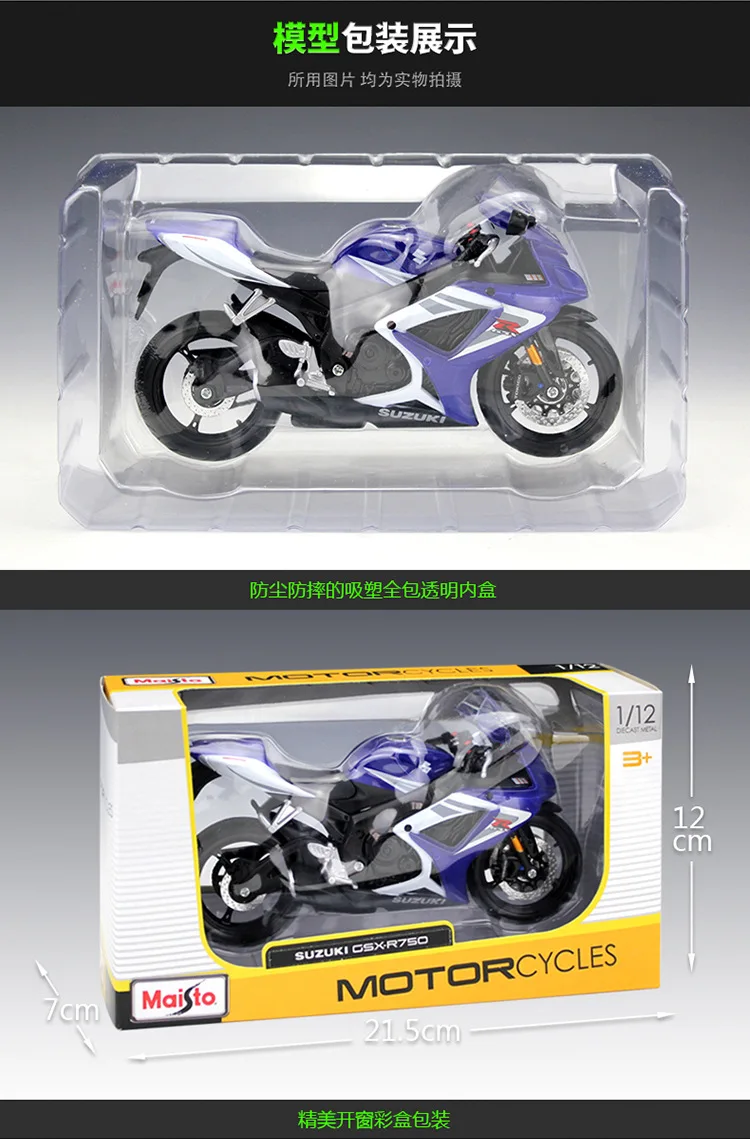 This highly detailed 1:12 scale die-cast motorcycle model measures approximately 17cm x 6cm x 8cm and features a predominantly plastic construction with a metal fuel tank. Crafted from eco-friendly ABS plastic and cast metal, it includes functional swinging front wheels and handlebars, a spring rear suspension, activity rack, and free wheel movement. Available in three dynamic variants—GSX-R750, GSX-R1000, and GSX-R600—each exhibits vibrant color schemes and realistic detailing, including aerodynamic fairings, stylized graphics, transparent turn signals, and textured engine components. Perfect for adult collectors, this model combines quality craftsmanship with authentic design, bringing your motorcycle passion to life with a sleek, racing-inspired aesthetic.