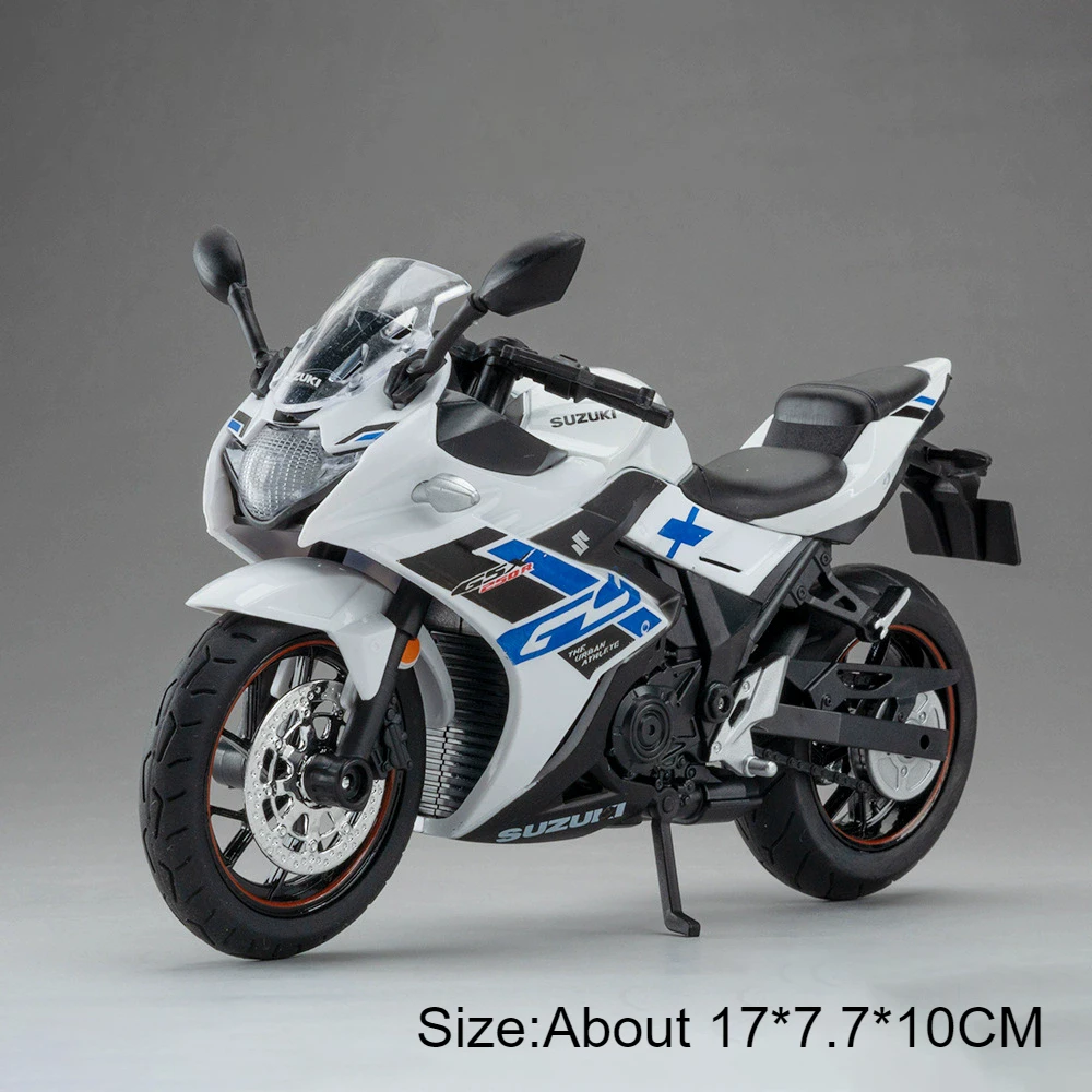 Experience the thrill of owning a highly detailed miniature motorcycle with this 1:12 scale model, perfectly capturing the dynamic essence of real high-performance bikes. Designed with an eye for realism, this model features a sleek metal body complemented by rubber tires, offering both durability and authenticity. The crisp white color, combined with precise angular lines and aerodynamic contours, enhances its sporty aesthetic. Whether displayed on a shelf or used for creative display, you'll appreciate its intricate mechanical details such as the engine casing, exhaust, and suspension components. With functional sound and light effects, front wheel steering, shock absorption, and a retractable tripod, this model makes an excellent addition for collectors and motorcycle enthusiasts alike. Its refined craftsmanship truly brings high simulation quality to life.