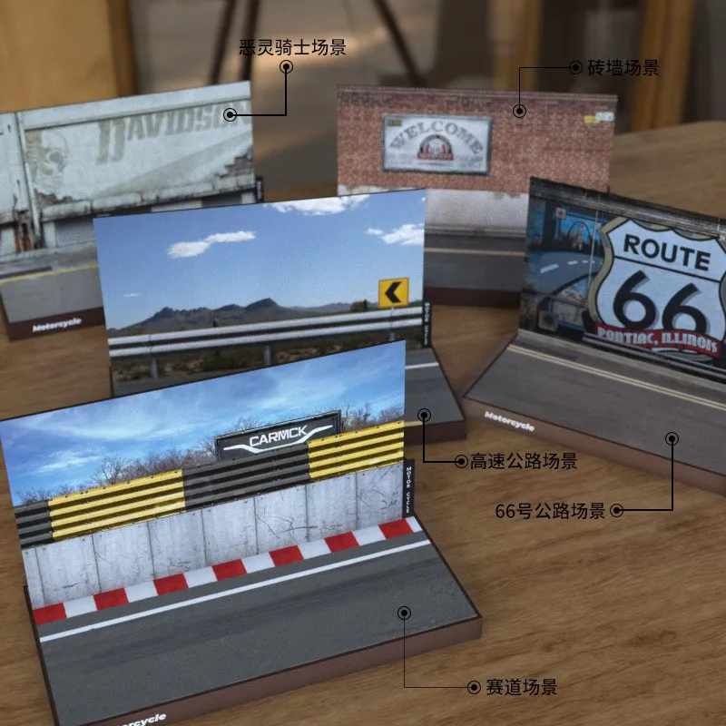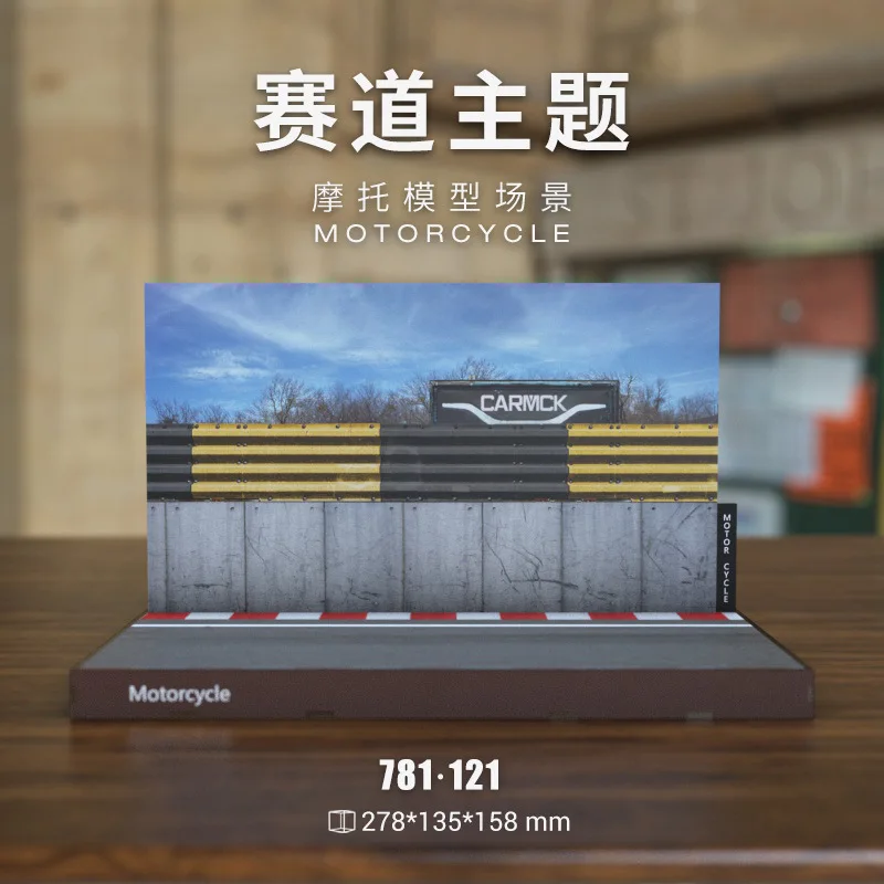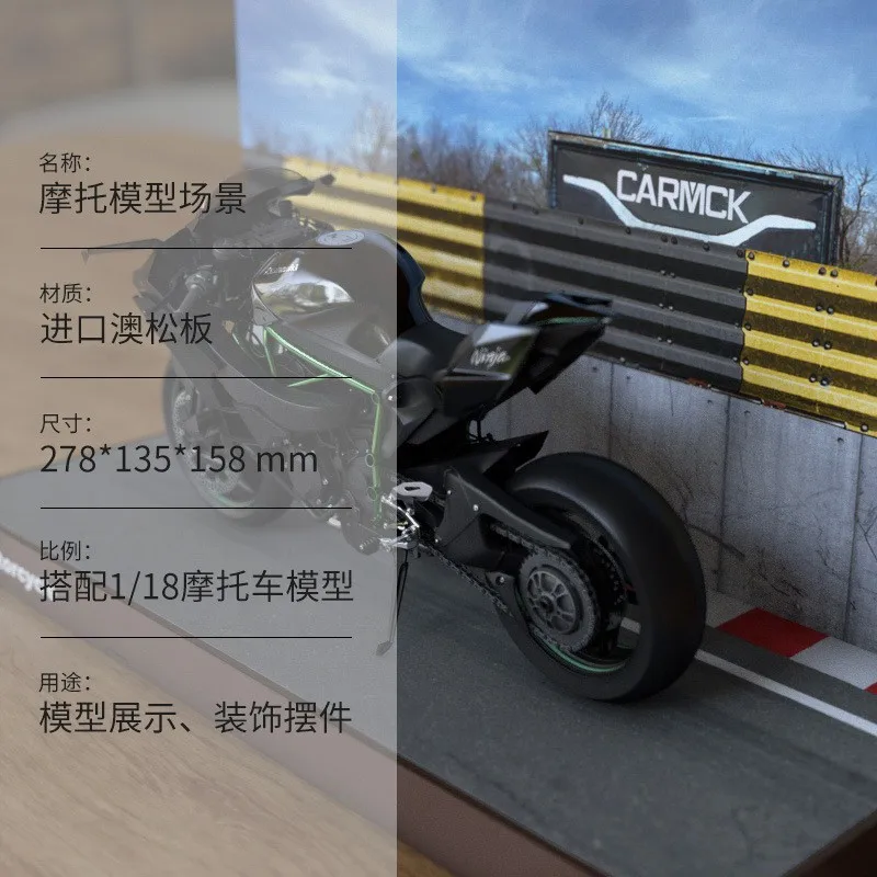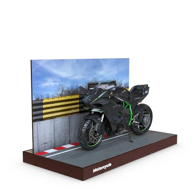 Transform your collection with this highly detailed 1:12 scale motorcycle scene crafted from durable wood MDF, featuring a sleek black motorcycle with subtle green accents on the trellis frame and highlights. The aerodynamic fairings, textured rubber tires, and realistic components like disc brakes and panel details showcase expert craftsmanship. The scenic backdrop depicts a vibrant outdoor environment with a blue sky, clouds, and treetops, enhancing the display’s realism. A striking yellow and black safety barrier adds an element of authenticity. Designed for ages 14 and up, this non-electric, battery-free collectible is perfect for enthusiasts seeking a sophisticated display piece.