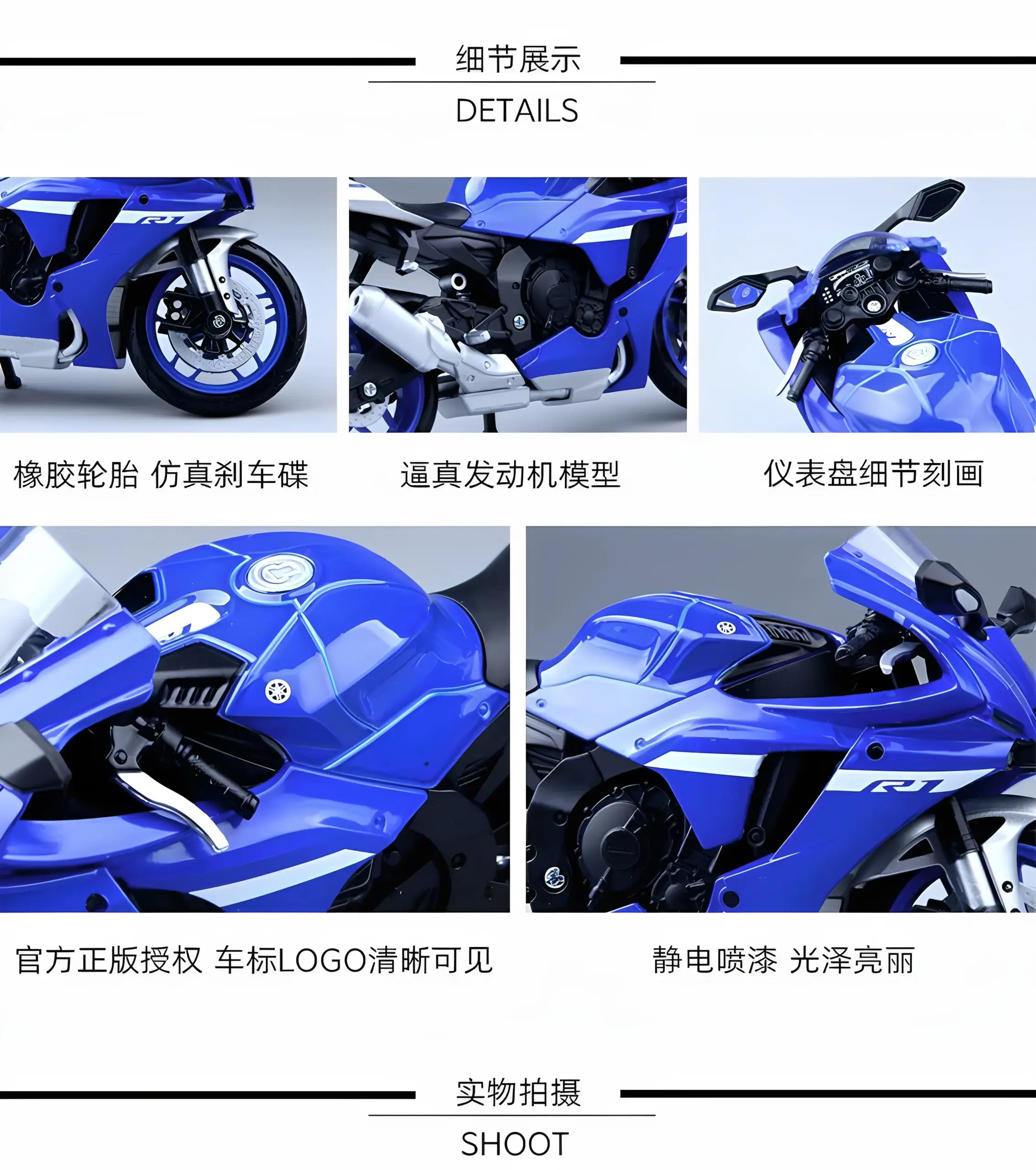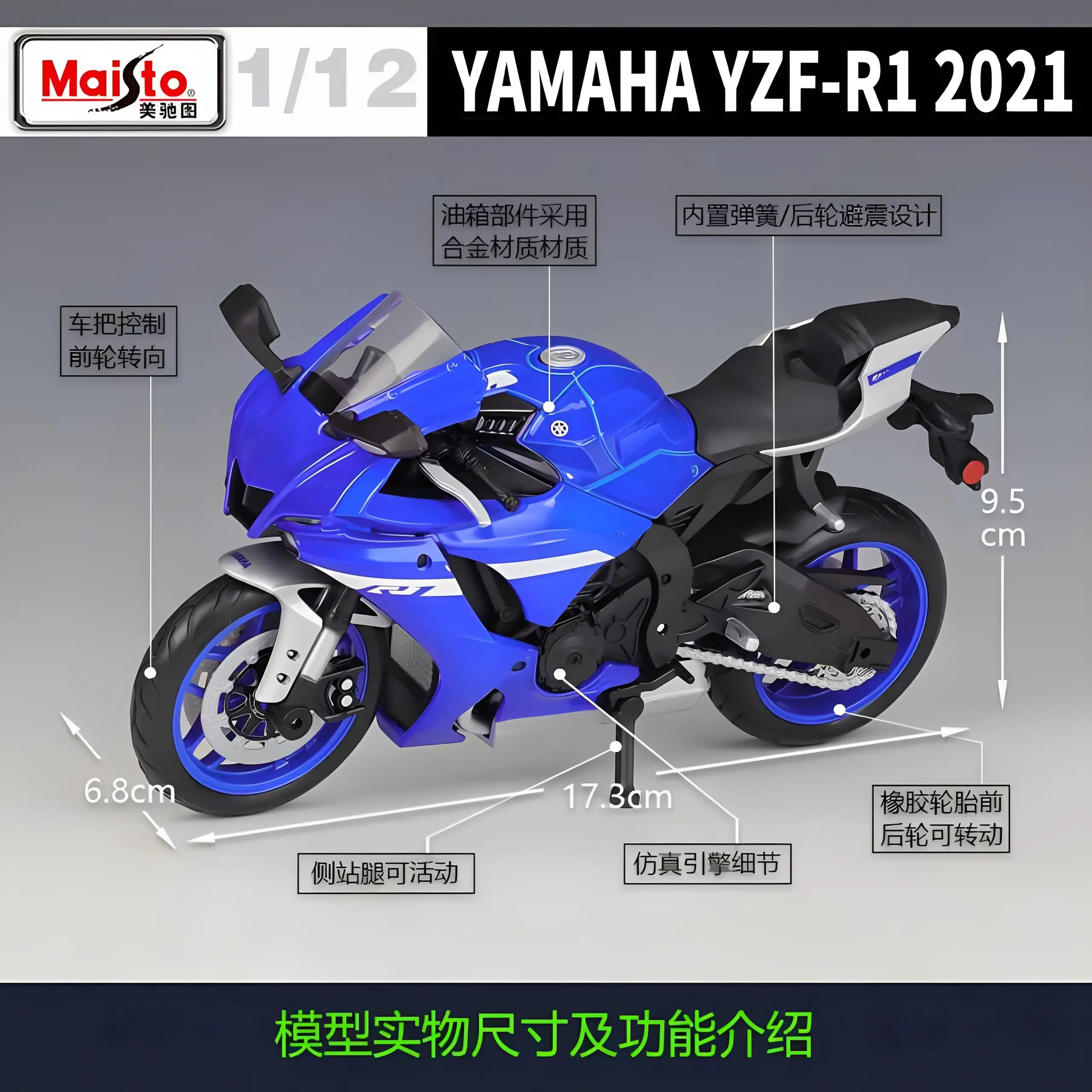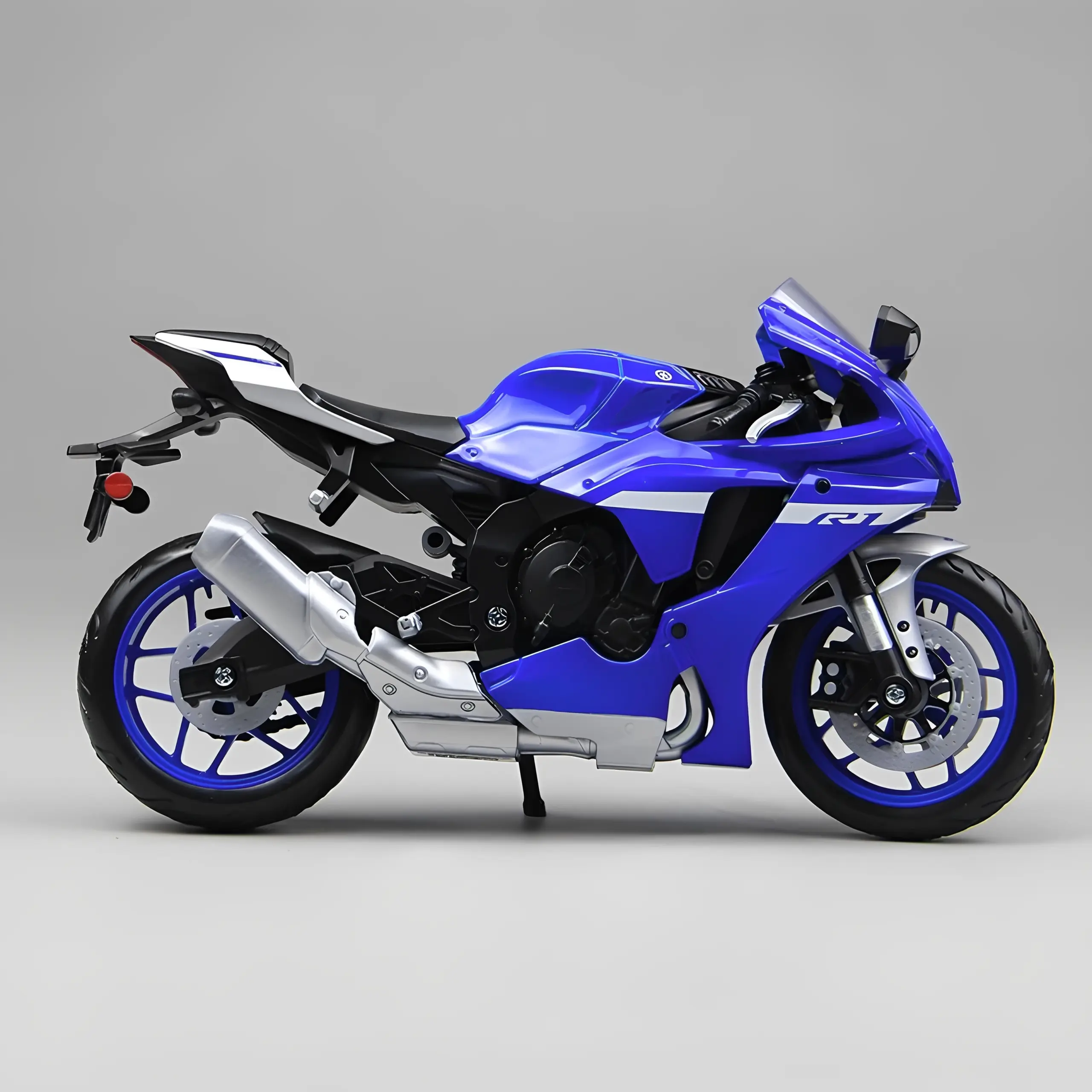 - This 1:12 scale Yamaha YZF-R1 model features a vivid blue or black finish, with a sleek aerodynamic shape that accurately reproduces the design of the original sportbike.