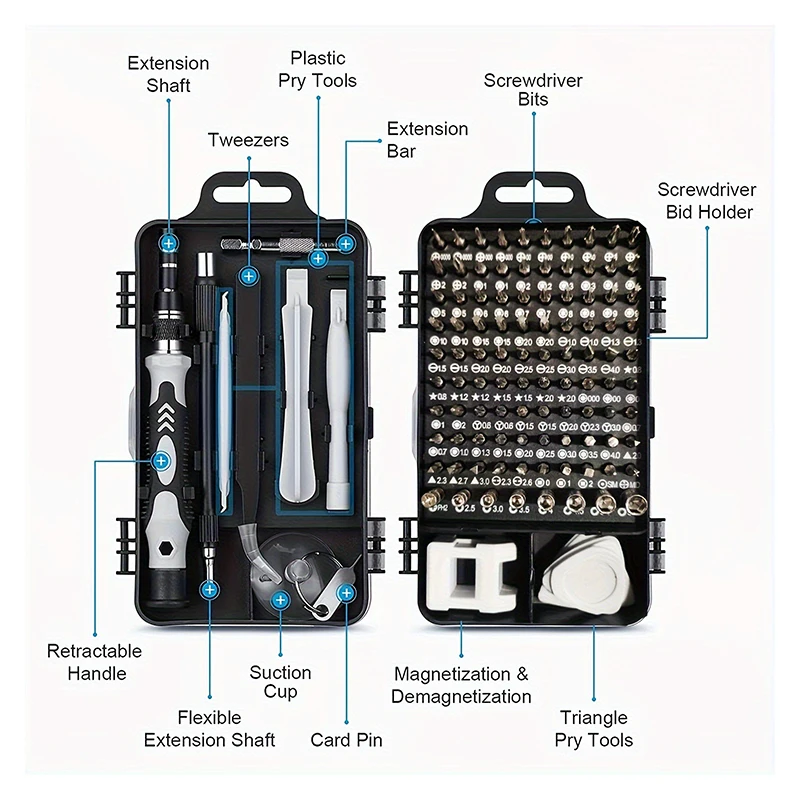 - Equipped with various adapters and extensions, made of durable metal, to access hard-to-reach areas in electronic devices, ensuring versatility in repair scenarios.