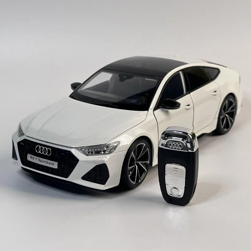 Experience the thrill of owning this meticulously crafted 1:18 scale diecast model of the iconic Audi RS7 sports car. Crafted from alloy and plastic, this model captures the sleek, aerodynamic lines and aggressive stance of the real vehicle. The glossy black finish, available also in white and gray, highlights its refined details, from the large honeycomb front grille with metallic accents to the sharply styled LED headlamps. The side profile showcases sculpted doors, detailed mirrors, and multi-spoke alloy rims with low-profile tires, emphasizing its sporty character. The rear features precise tail lights, a subtle integrated spoiler, and exhaust outlets, bringing authenticity and sophistication to your collection. Its realistic sound and lighting functions add an extra layer of immersion.