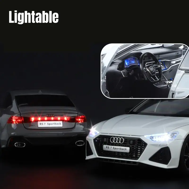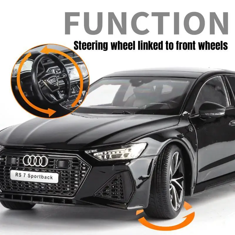 Capture the essence of high-performance engineering with this 1:18 scale Audi RS7 Sportback diecast model. Measuring approximately 12.5 cm in length, it features a durable alloy metal construction with a glossy black finish, detailed honeycomb grille, sharp LED headlights, and textured rubber tires on multi-spoke alloy wheels. Transparent windows reveal a meticulously crafted interior, while a pull-back motor adds dynamic movement. Enhanced with electronic sound and lighting effects powered by batteries, this model exudes realism and craftsmanship. Available in black, gray, and white, it’s the perfect addition for collectors and enthusiasts seeking a highly detailed, authentic miniature of the iconic Audi RS7 Sportback.
