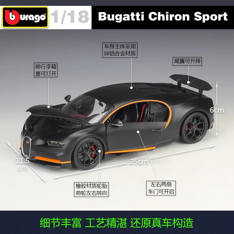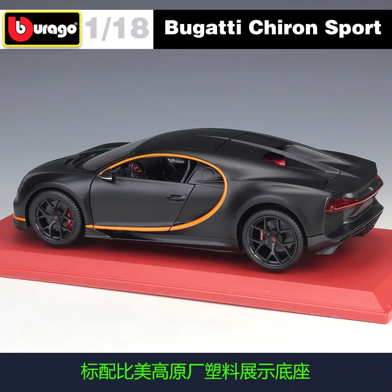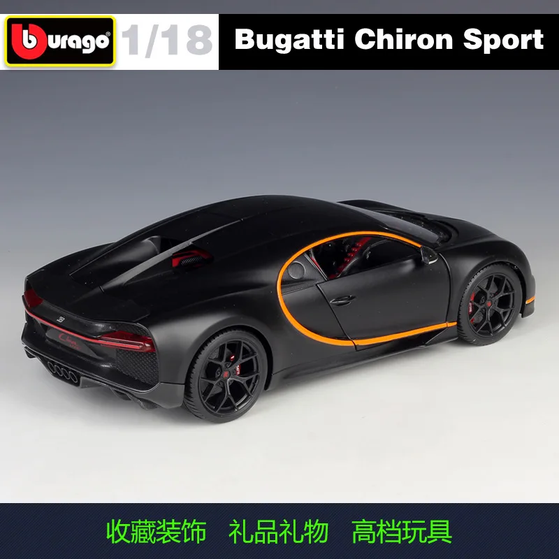 Immerse yourself in the sleek elegance of this 1:18 scale diecast model of the Bugatti Chiron Sport, crafted from high-quality metal. Finished in a sophisticated black matte, it features smooth aerodynamic contours, a chrome-accented horseshoe grille, sharp detailed headlights, and elegant side door lines with sporty orange accents. The transparent side windows reveal a meticulously detailed interior, while the black alloy-style rims with red brake calipers add exclusive sporty flair. With tail lights, subtle exhaust details, and a slightly raised rear section, this collectible toy captures the essence of the high-performance Chiron Sport, making it a perfect addition for adult enthusiasts and collectors.