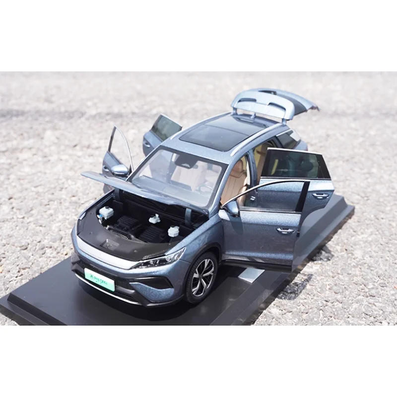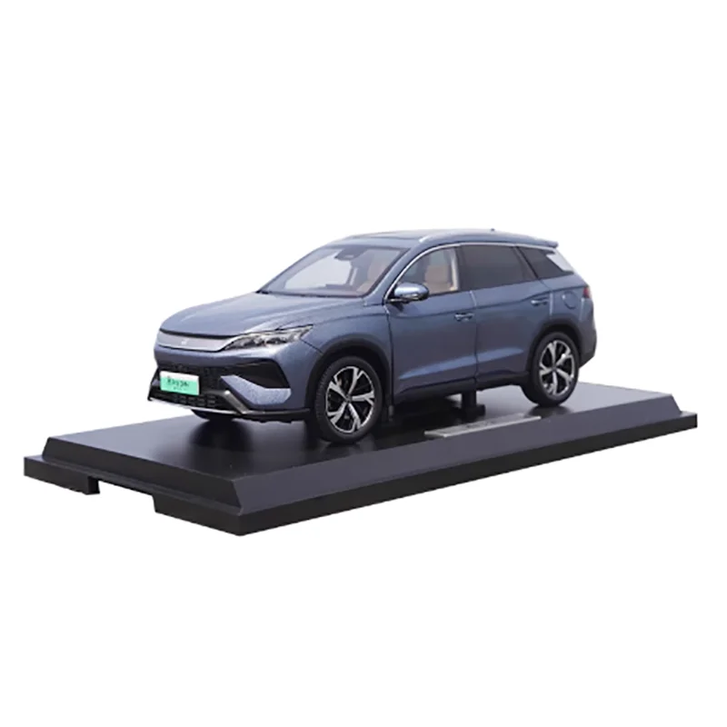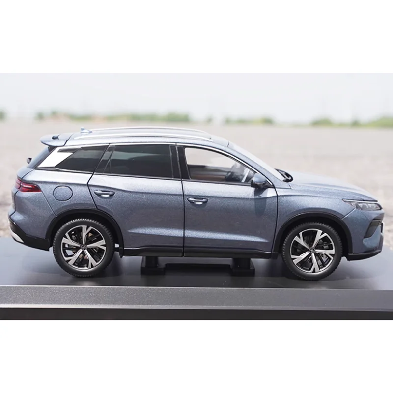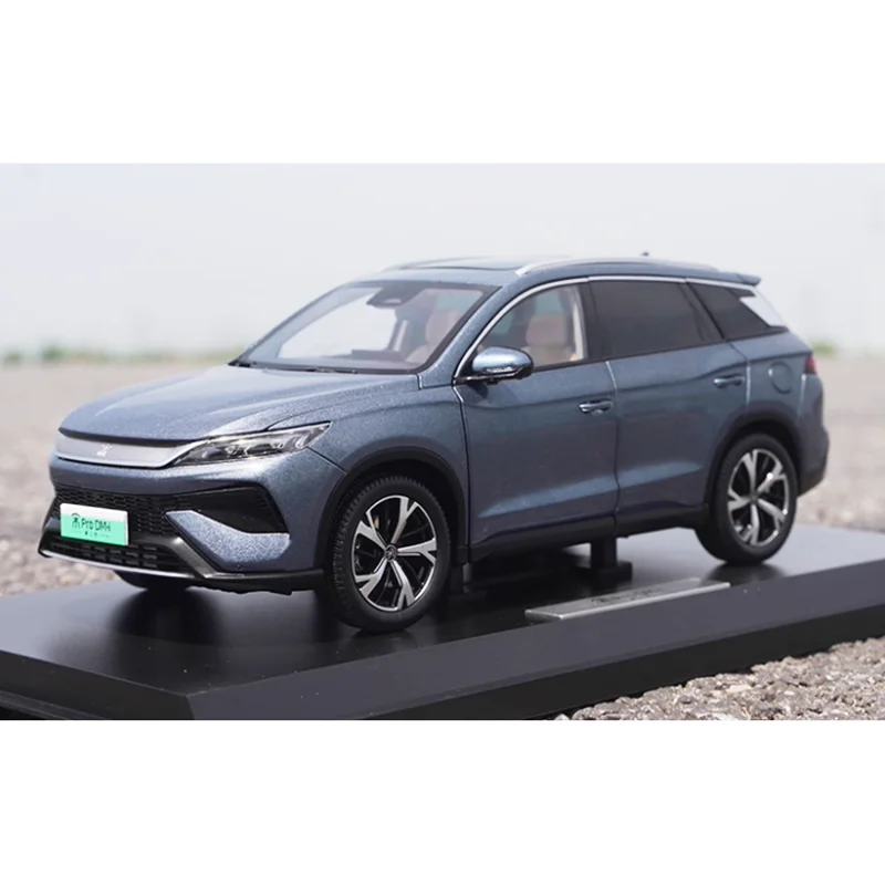 Discover the stunning realism of this 1:18 scale diecast alloy model of the BYD Song Pro DM-i SUV. Crafted with precision, it features a metallic blue-gray paint with a subtle shimmer, emulating the glossy finish of an actual vehicle. The sleek, modern aesthetic includes narrow, angular headlights seamlessly integrated into the body, a minimalist black mesh grille, and a boldly sculpted front bumper with angular air intakes. The aerodynamic side profile showcases smooth lines accented by chrome details around the windows and shiny, metallic-finished side mirrors. The flush door handles enhance the streamlined look. The alloy wheels have a multi-spoke design in black and silver, with detailed tires displaying realistic treads. The rear boasts narrow taillights, a sculpted bumper, and a slightly tinted rear window, capturing the overall sporty and elegant stance of the real BYD Song Pro DM-i SUV.