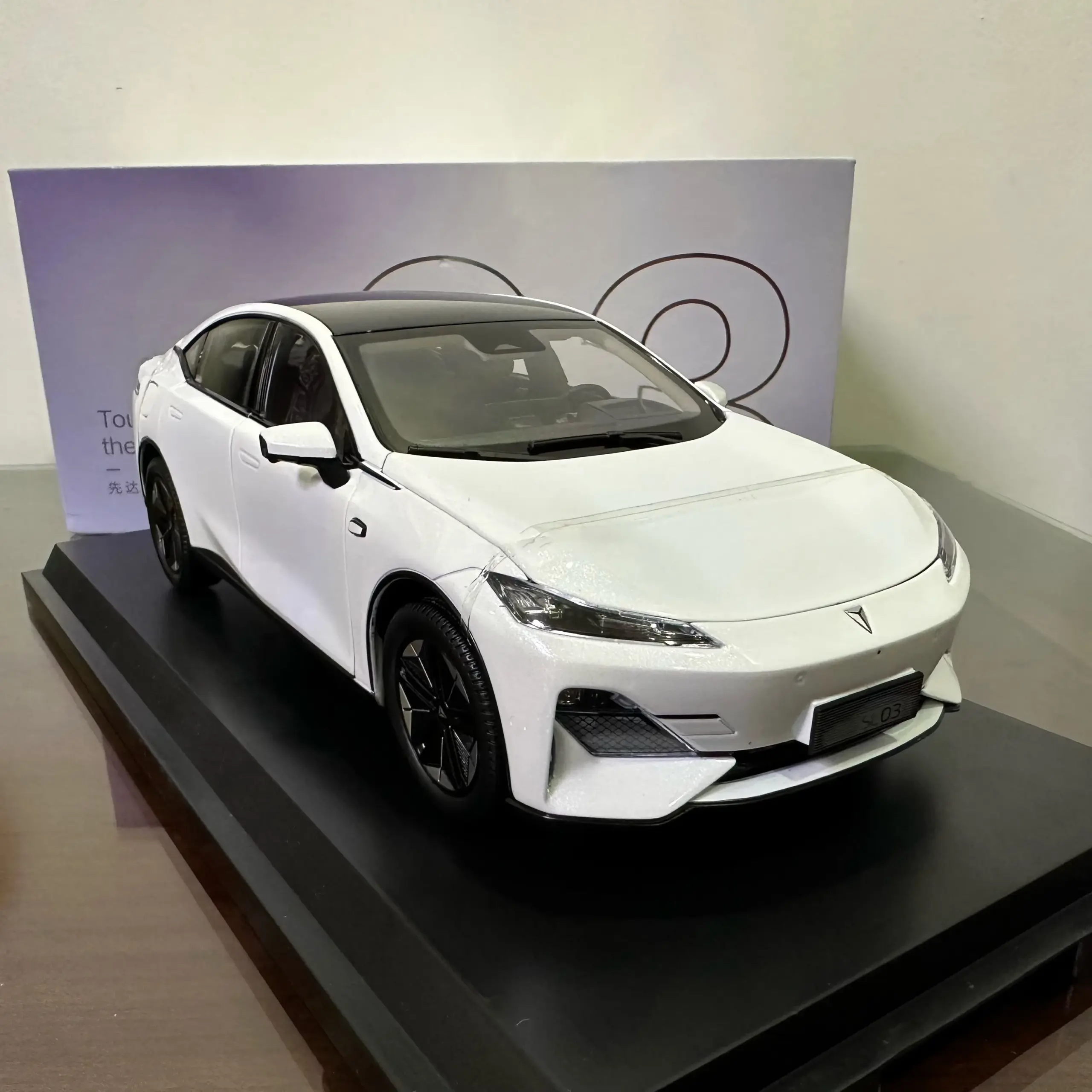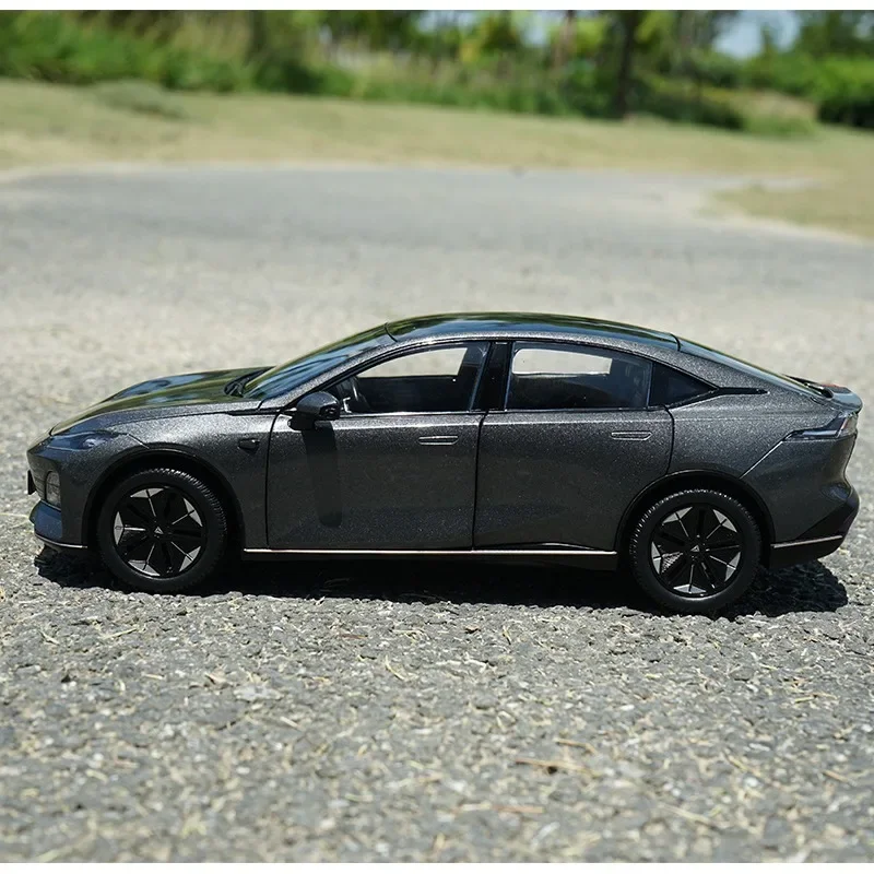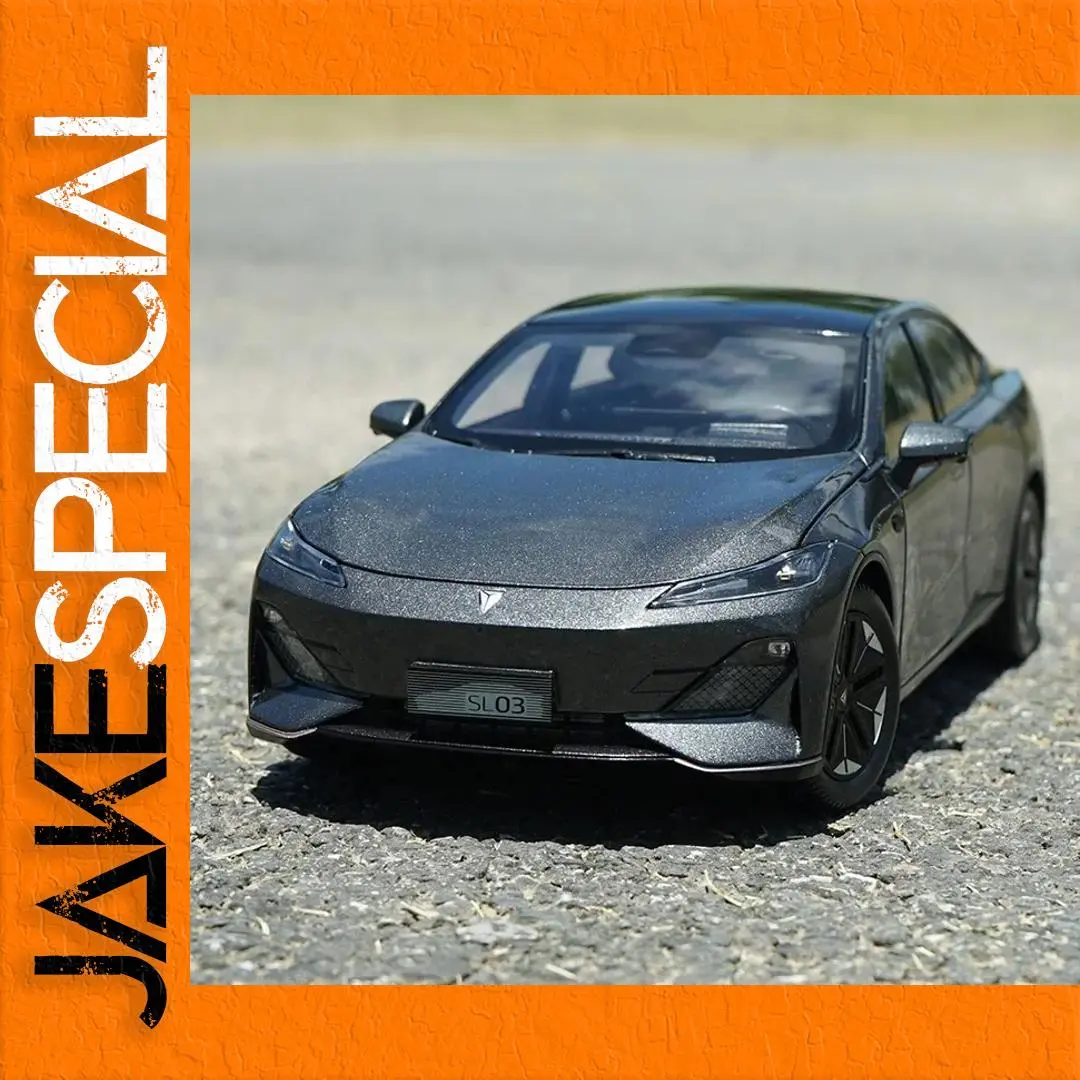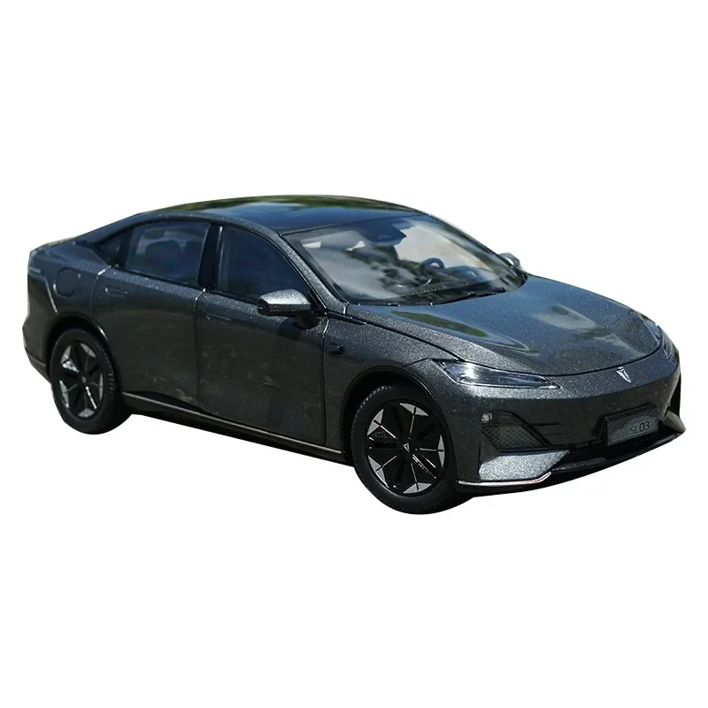 This 1:18 scale diecast model of the Changan SL03 captures the sleek, modern sedan with a compact, aerodynamic design finished in a metallic deep charcoal or gunmetal gray shade. Crafted from zinc alloy, plastic, and rubber, it features detailed narrow headlights, a refined grille with prominent emblem, angular sport-style bumper, and precisely defined side mirrors and door handles. The transparent windows reveal a glimpse of the interior, while the multi-spoke wheels complete its sophisticated aesthetic. Designed as a collectible ornament and decorative toy, this metal model offers a stylish, high-quality addition to any collection, perfect for adult enthusiasts who appreciate detailed craftsmanship and contemporary design.