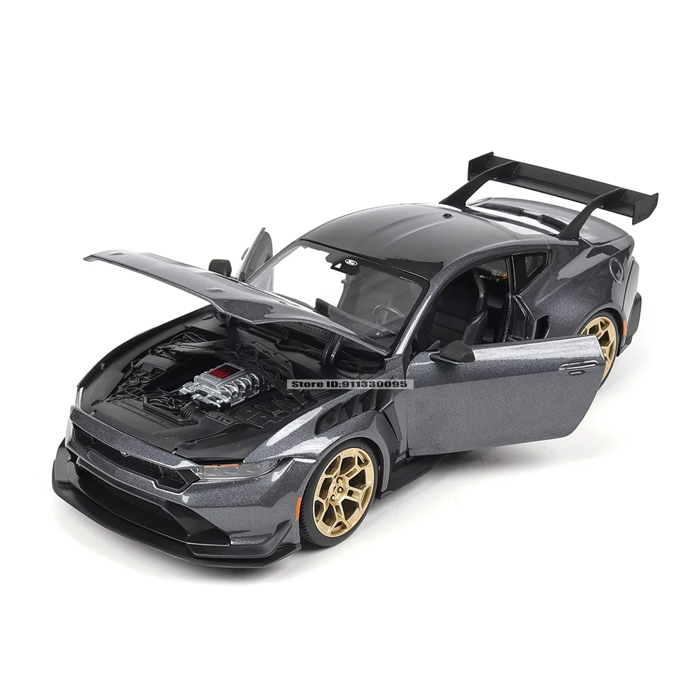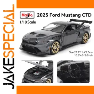 Experience the thrill of owning a meticulously crafted 1:18 scale replica of the 2025 Ford Mustang CTD. This die-cast model by Maisto captures every detail, from its sleek metallic dark gray finish to its aerodynamic contours and aggressive stance. The model features detailed front grille with Mustang emblem, narrow headlights, flared fenders, and stunning gold alloy wheels with intricate multi-spoke design. The rear showcases a prominent black spoiler, taillights, diffuser elements, and exhaust tips, all finely detailed for authenticity. Ideal for collectors, it rests on a black base, making it a perfect display piece or gift. Its high-precision craftsmanship makes it a captivating addition to any automotive collection, embodying the power and style of the legendary Mustang.