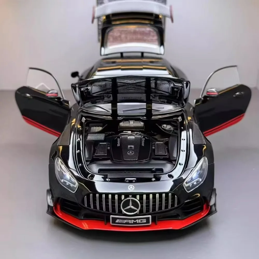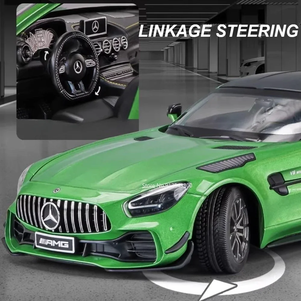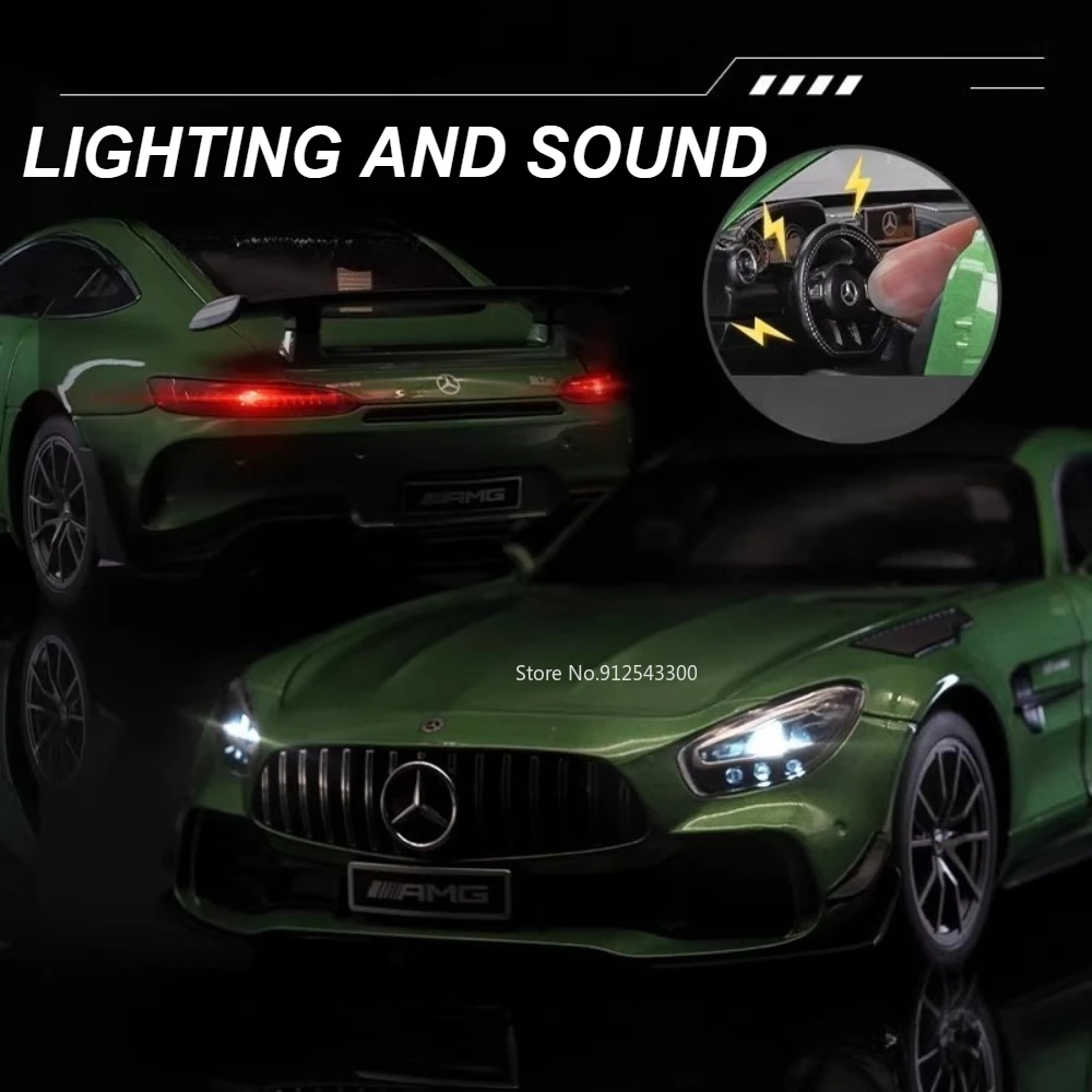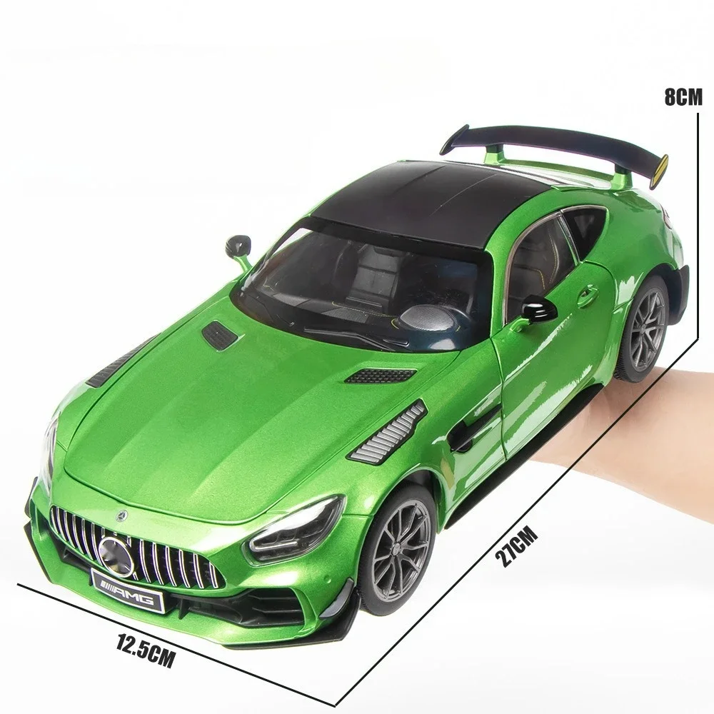 Experience the thrill of owning this highly detailed 1:18 scale green GTR diecast car, perfect for collectors and enthusiasts alike. With its vibrant green exterior accented by sleek black components, including a roof and side mirrors, this model captures the essence of a high-performance sports car. Its aerodynamic design, sharp lines, and smooth curves reflect a luxurious, modern aesthetic. The accurate front grille with chrome bars and central emblem, along with intricate headlight details and hood vents, add realism and sophistication. Measuring about 27 x 12.5 x 8 cm, it also features functional elements like sound and light, pull-back action, and doors that open smoothly. This durable, metallic-bodied model makes an impressive display piece or gift.