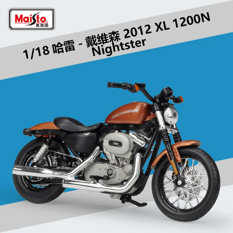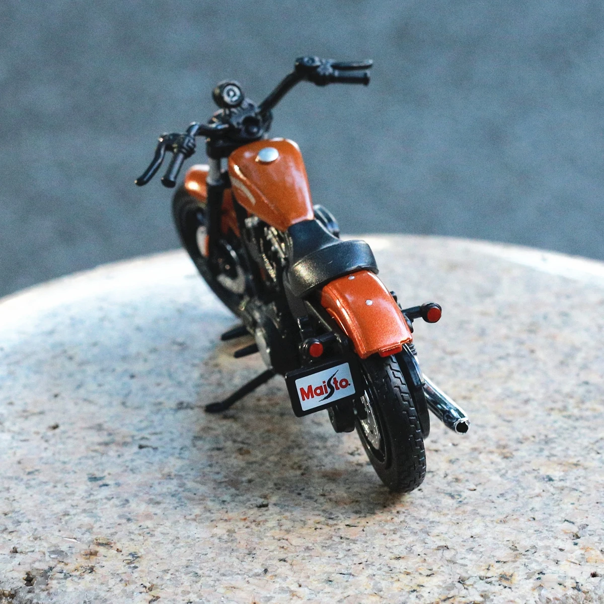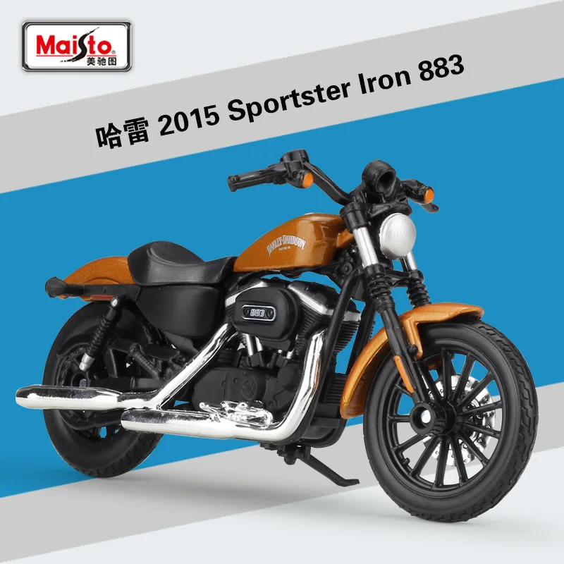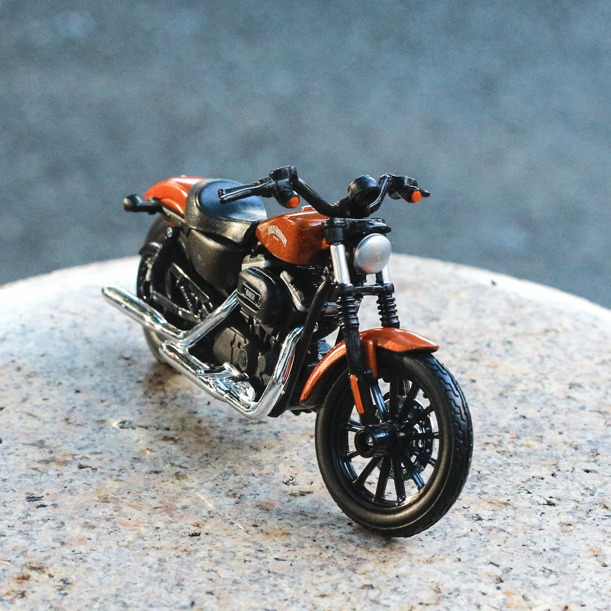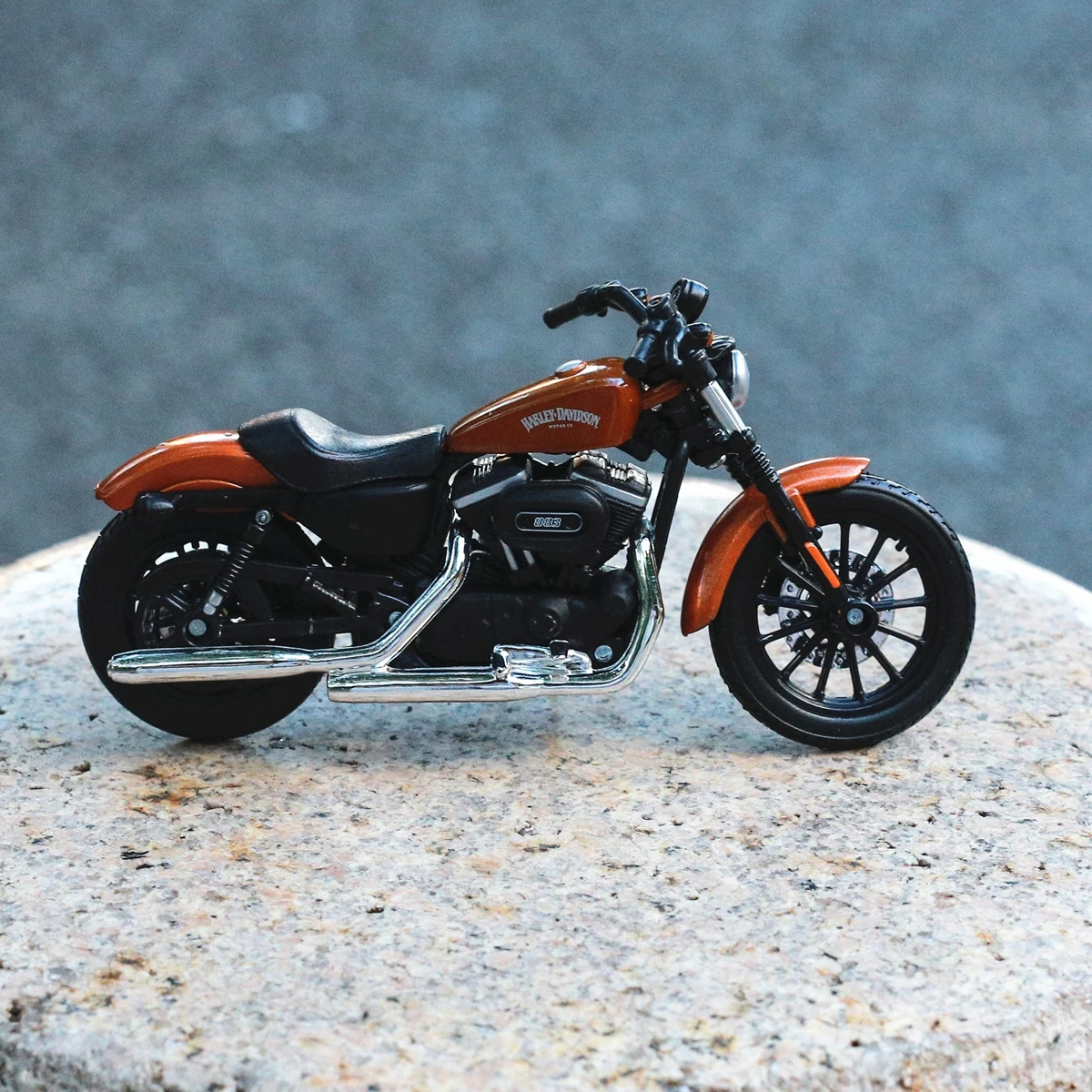 This stunning 1:18 scale model of the Harley Davidson Sportster Iron 883 motorcycle features a sleek matte black body with metallic accents, embodying both classic and contemporary design elements. Crafted from durable diecast metal and plastic, the model showcases shiny chrome exhaust pipes in a dual-pipe design, black spoke wheels with textured tires, polished black front forks and handlebars, and a realistic silver headlight. The low-profile molded seat adds to its streamlined look. With fine craftsmanship and an authentic appearance, this collectible model is perfect for enthusiasts and collectors alike.