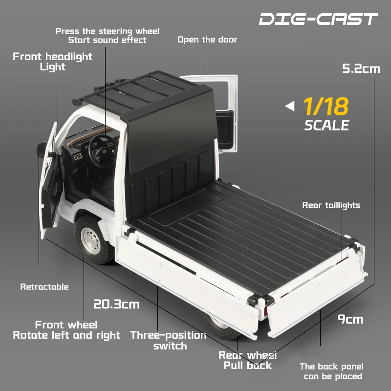Experience the realism and durability of this 1:18 scale diecast model of the Honda ACTY 4WD Attack Pickup Truck, crafted from alloy metal and available in vibrant blue with a contrasting white roof. Featuring detailed black trim around the curved windshield and windows, bright yellow headlights, and a rugged black grille with red reflectors, this model captures the true essence of off-road style. Equipped with sound and light functions, a pull-back mechanism, and detailed silver wheels with realistic tread patterns, it’s perfect for collectors and enthusiasts aged 14 and above seeking a high-quality, authentic display piece.
