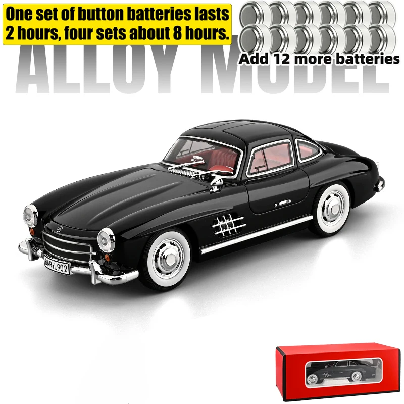 Experience the timeless elegance of the 1:18 scale Benz 300SL diecast model, crafted from durable alloy metal with a glossy black finish that highlights its sleek, vintage curves and aerodynamic design. LED highlights include gullwing doors opening to reveal vibrant red interior details, complemented by chrome accents on the bumper, grille, and side mirrors. The model features detailed headlights, taillights, realistic silver hubcaps, and measurements suitable for collectors and racing enthusiasts. Powered by a button battery (AG13 type), it is available in black, green, and white options, and designed for ages 18+ as a high-quality, decorative piece or holiday gift, perfect for display or racing game enthusiasts.