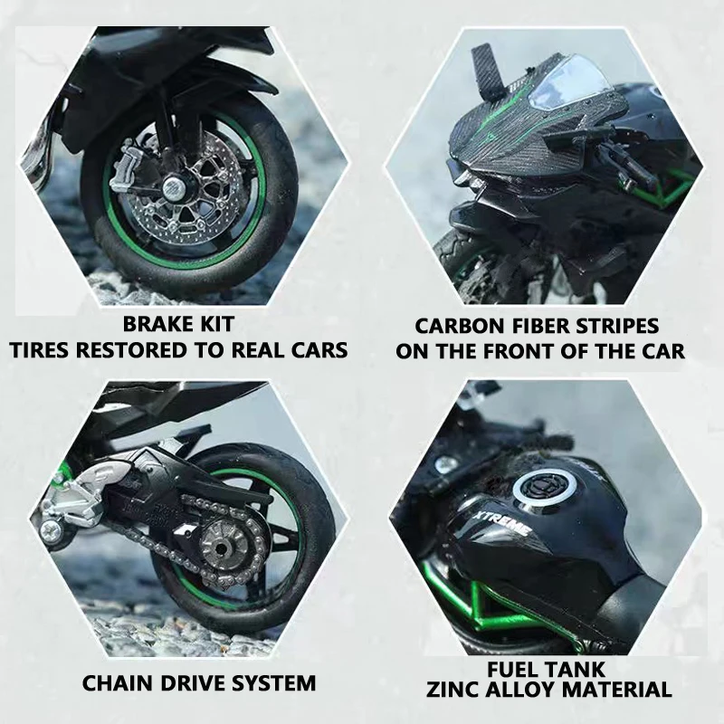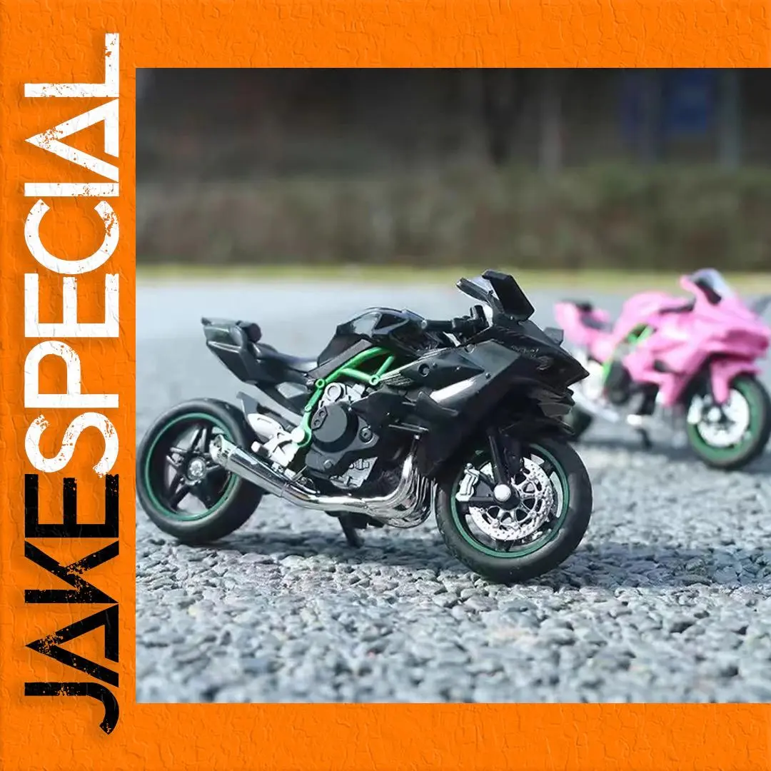 The 1:18 Ninja H2R Diecast Motorcycle Model is a stunning representation crafted from zinc alloy, ABS, and rubber, showcasing a sleek black finish with striking green accents on the frame and engine guards. Featuring intricate detailing, the model includes realistic silver wheels with green rim highlights and chrome exhaust pipes that reflect light. Workable shock absorbers enhance the model’s interactive experience. Designed at a 1:18 scale, it brings the allure of high-performance sport bikes to your collection. Maintenance is simple—just wipe with a bit of alcohol using a dry cloth.