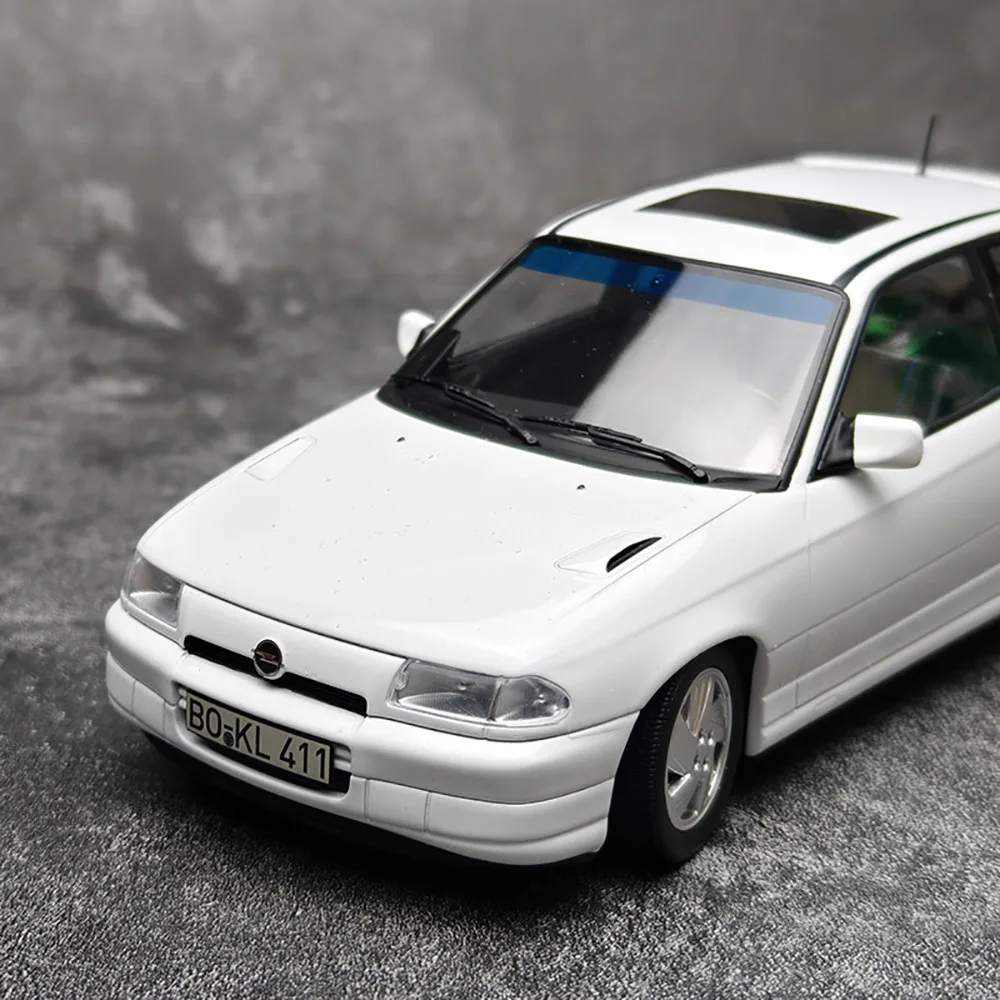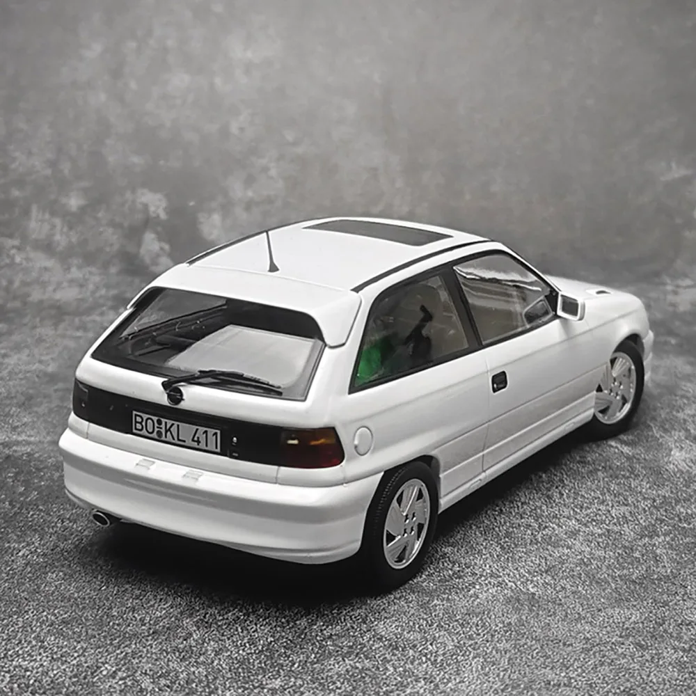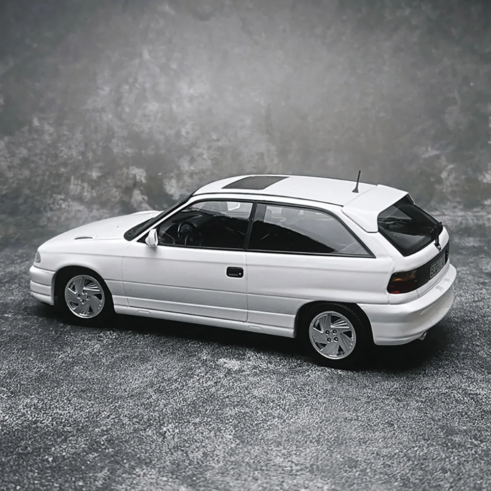 Step into the world of automotive miniatures with this finely crafted 1:18 scale Opel Astra Gsi 1991 model. Designed for collectors and enthusiasts, it showcases a sleek, white body with a smooth, aerodynamic hatchback silhouette. The model captures intricate details, including realistic headlights with subtle curves, a black grille with the Opel emblem, and clear, tinted windows with etched frames. The black sunroof adds a touch of realism, while the silver multi-spoke rims with black rubber tires enhance its authentic appearance. Every line and contour reflects meticulous craftsmanship, making it a perfect decorative piece for display cases or as a thoughtful gift. Its size and highly detailed finish make it an eye-catching centerpiece for any collection or office space.
