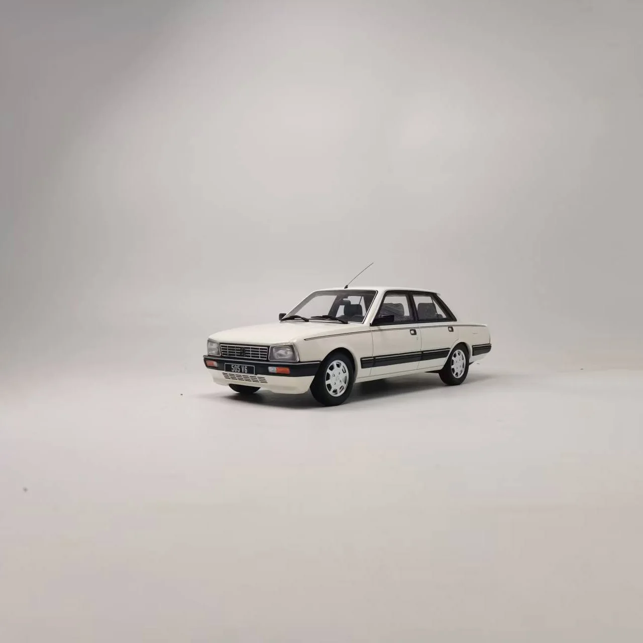 Immerse yourself in automotive elegance with this 1:18 scale resin model of the Peugeot 505 V6, featuring a sleek white body accented by black details on the front grille, side mirrors, and window trims. Crafted from resin, rubber, and plastic, this static collectible captures the boxy, classic shape with sharp, geometric lines and a slightly sloped windshield. The detailed front features a rectangular grille with horizontal slats, embedded headlights, and amber turn signals. Transparent windows reveal a simplified interior, while the black rubber tires add realism. Perfect for display, gifts, or souvenirs, this model offers precise craftsmanship and a nostalgic charm for enthusiasts.