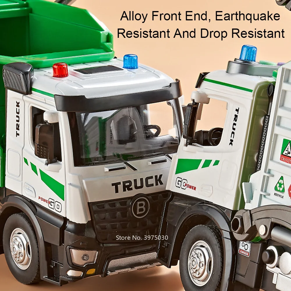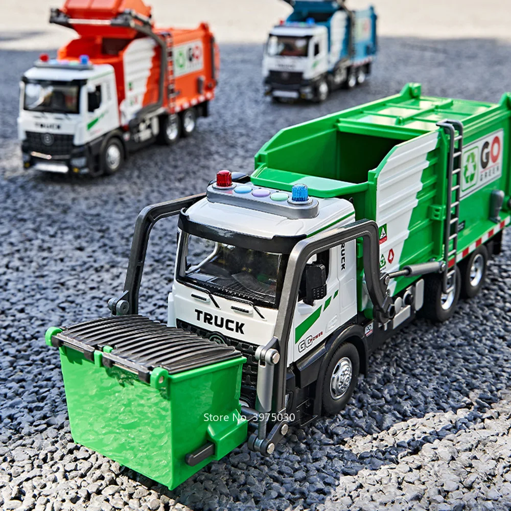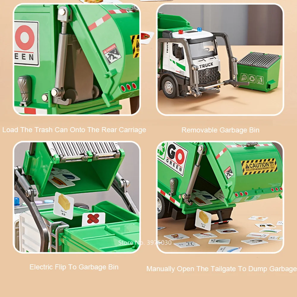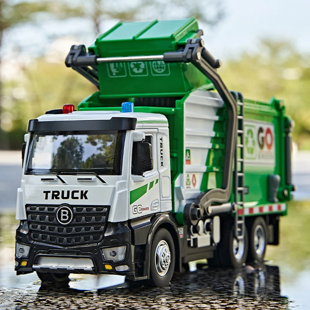 Imagine owning this highly detailed miniature sanitation truck and adding it to your collection. Designed with an authentic appearance, this truck boasts a zinc metal body, vibrant colors, and dynamic features like opening doors, sound, and light effects. Its bright blue or green finish, complemented by printed recycling symbols and hazard icons, creates a highly realistic look. The model's sturdy rubber tires, shiny spray paint, and functional mechanical arm make it not only eye-catching but also durable. Perfect for enthusiasts aged 14 and above, this toy captures the industrial essence of real sanitation trucks, making your display stand out with a mix of vibrant colors, sleek design, and intricate details that evoke quality and craftsmanship.