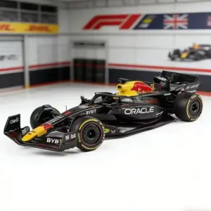 - Represents the iconic RB19 with authentic branding, including the Red Bull logo in vibrant red and yellow on the engine cover, offering a realistic racing appearance for display and collection.